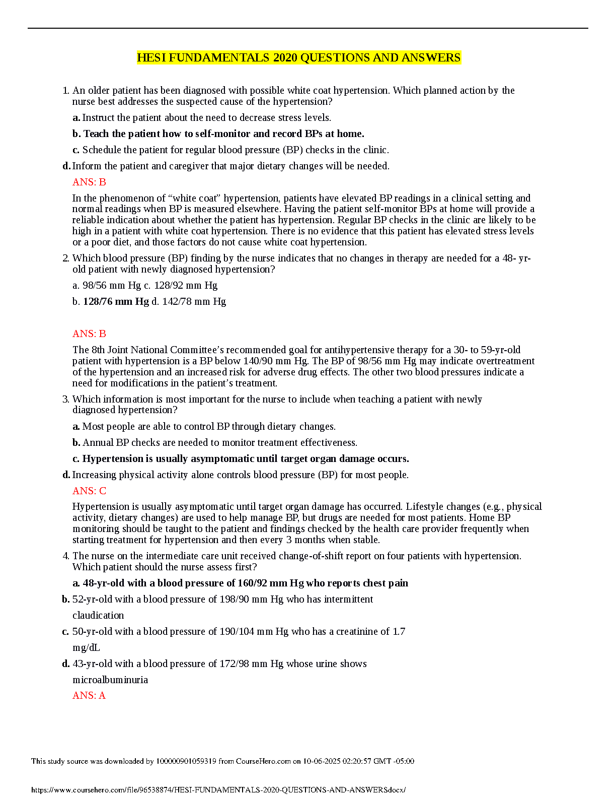 Ace your HESI Fundamentals exam with this ultimate study resource for the 2025/2026 academic year. This guide provides a comprehensive collection of exam-style questions, complete with verified answers and detailed rationales to deepen your understanding of core nursing principles. The questions cover critical topics tested on the actual exam, such as patient assessment, hypertension management, and prioritization of care. Designed to help you study effectively and avoid resits, this Q&A bank is your key to mastering the material and passing the HESI Fundamentals exam on your very first try. Download now to start your journey to success!