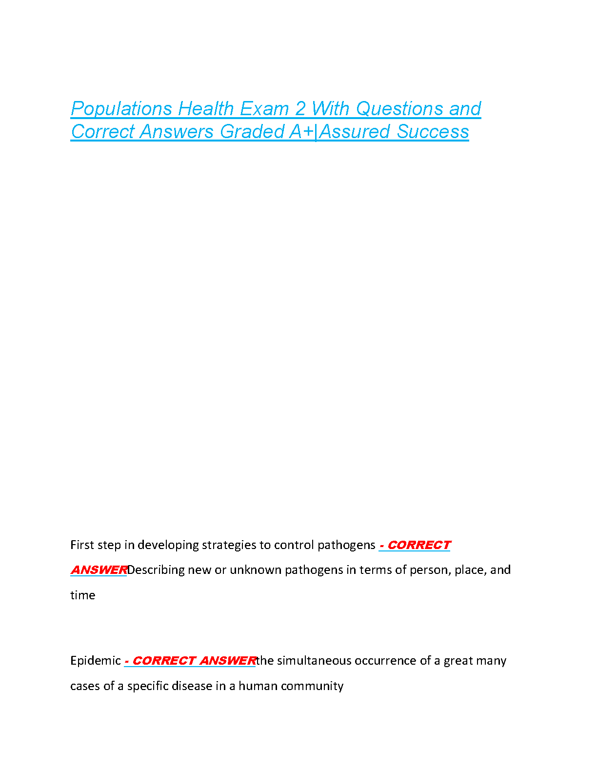 Unlock your A+ in Populations Health with our updated 2025/2026 Test Bank for Exam 2. This essential study guide is packed with authentic exam questions and detailed, 100% correct answers. Meticulously compiled to cover all critical topics, including strategies for pathogen control, the definition of an epidemic, and other core concepts, this resource ensures you are fully prepared. Stop cramming and start studying smarter. Our guide is expertly designed to help you master the material, confidently pass your exam on the first attempt, and avoid stressful resits. Download now for guaranteed success!