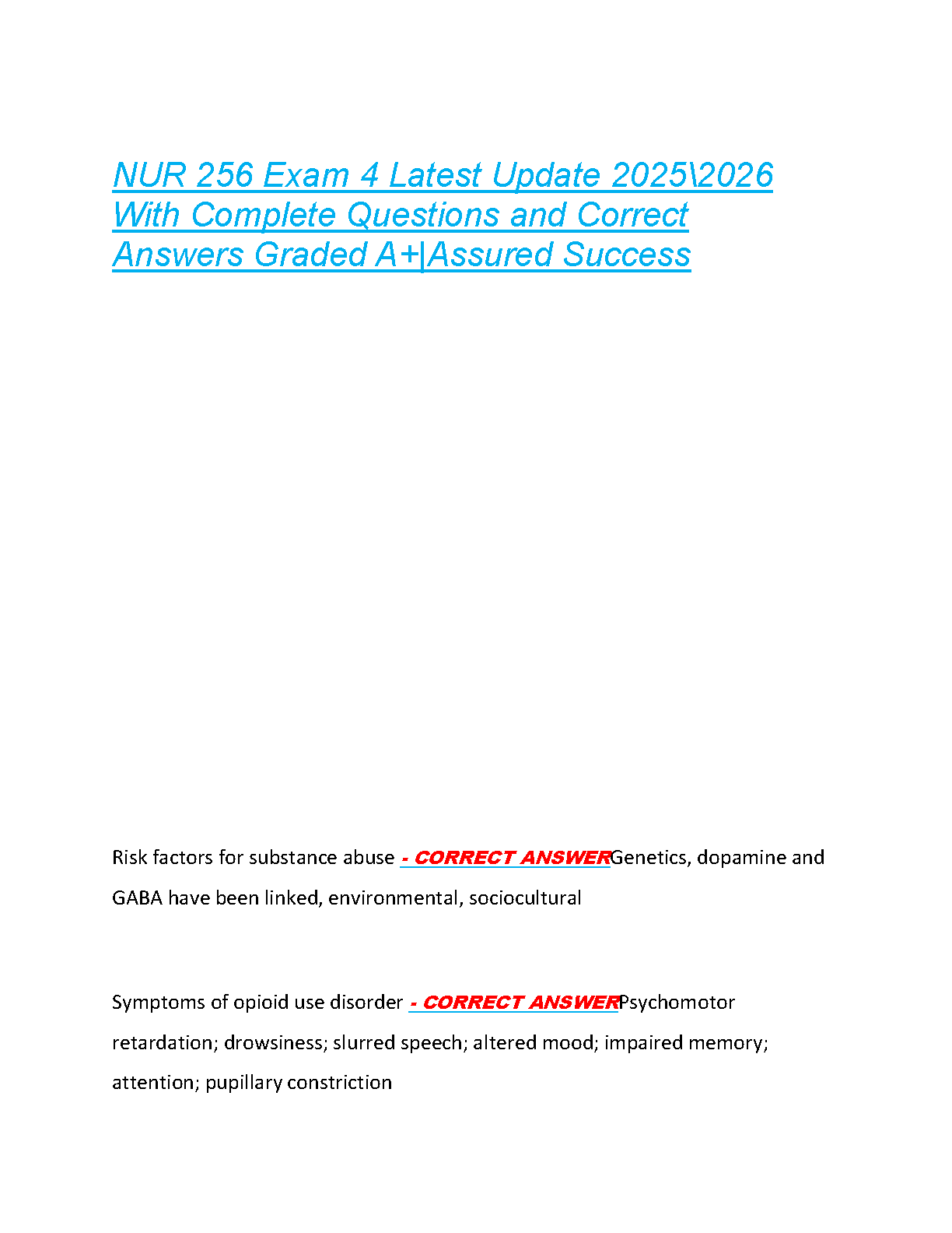 Ace your NUR 256 Exam 4 with our latest 2025/2026 Test Bank. This essential study resource provides a complete set of exam questions paired with 100% accurate, verified answers. Master key topics, including substance abuse and opioid use disorders, and gain the confidence to pass on your first attempt. Our guide is expertly compiled to ensure you achieve an A+ grade and avoid resits. Download now for guaranteed success in your nursing studies.