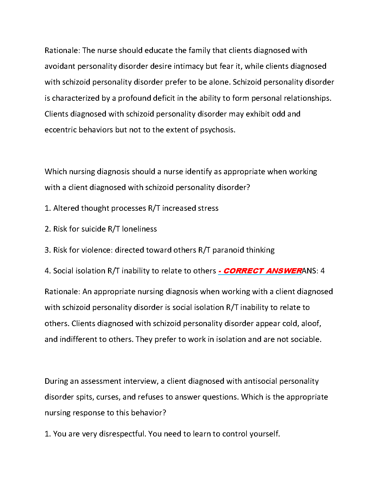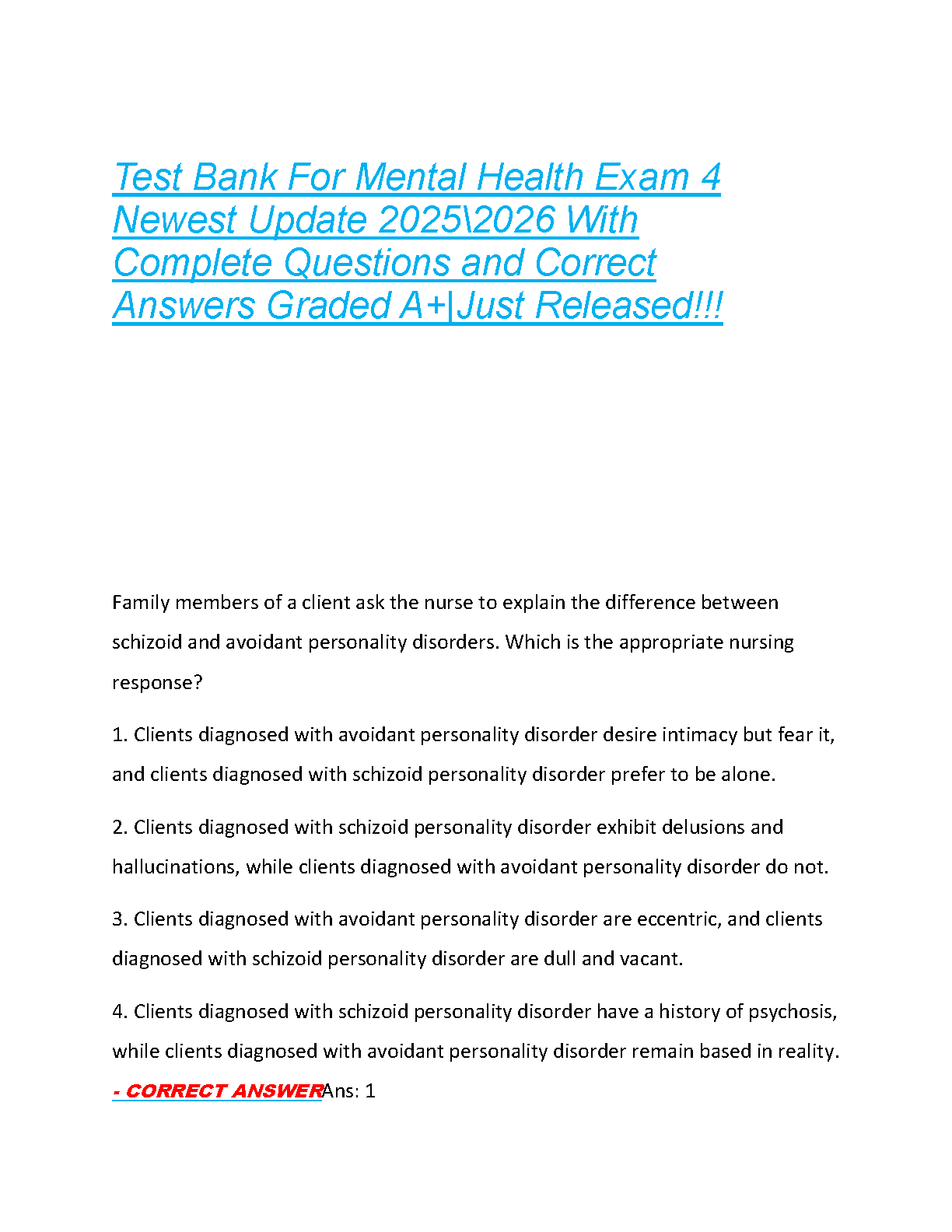 Unlock A+ grades in your psychiatric nursing course with the definitive test bank for Varcarolis' Foundations of Psychiatric-Mental Health Nursing, 9th Edition. This newly released 2025/2026 resource is packed with a complete collection of exam-style questions and meticulously verified answers. It's designed to help you master complex topics, such as the nuances between schizoid and avoidant personality disorders, ensuring you're fully prepared to ace your exams on the first try. Say goodbye to exam anxiety and resits—this essential study tool provides the practice and confidence you need for success in your mental health nursing studies.