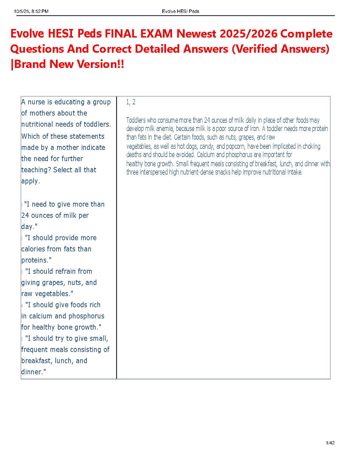 Ace your nursing exams with the ultimate study guide for the HESI Peds (Pediatrics) Final Exam. This comprehensive 2025/2026 test bank from Evolve features a complete collection of questions paired with detailed, verified answers and rationales. Designed to help nursing students master pediatric concepts and excel on their final exam. Download now to start preparing effectively and boost your confidence.