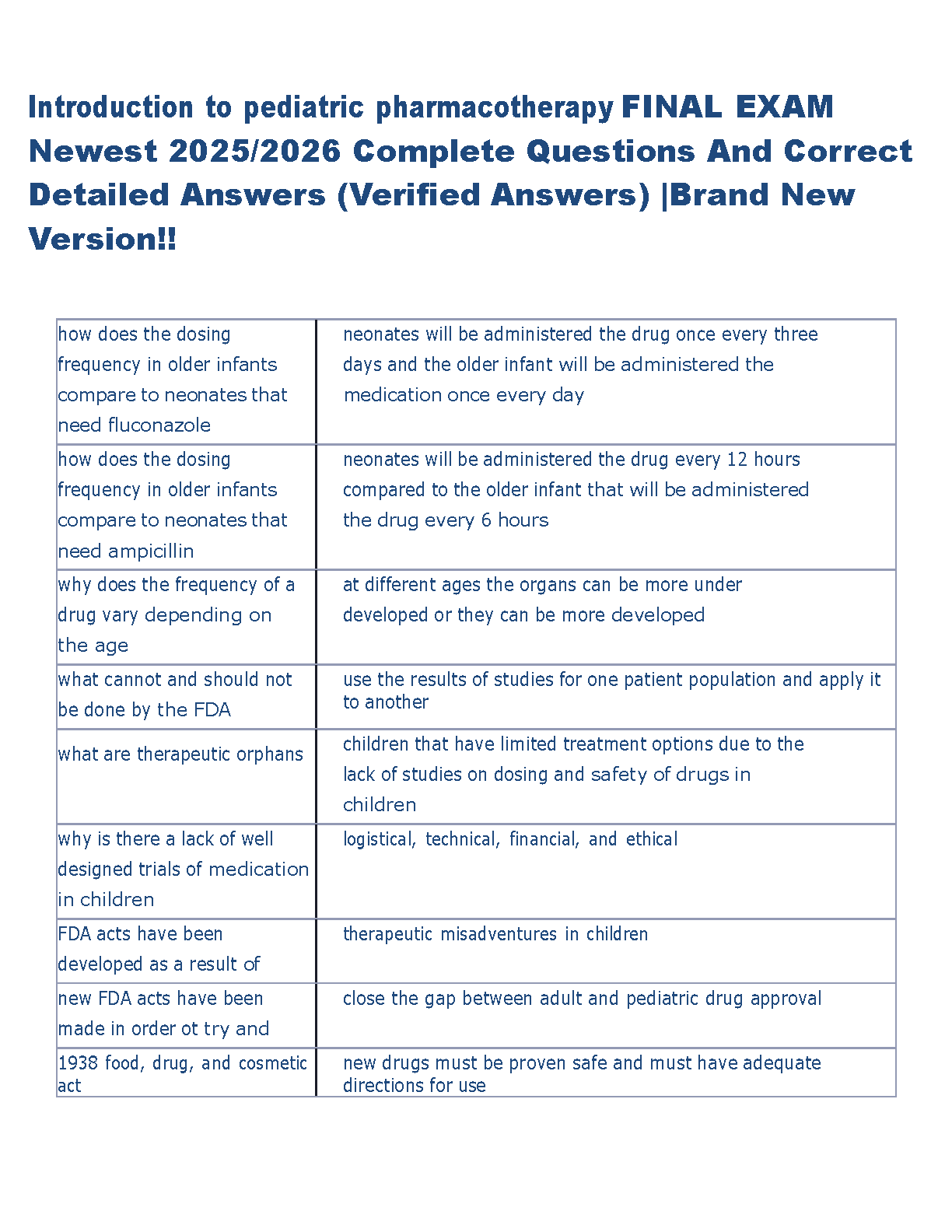 Ace your final exam with the newest 2025/2026 Test Bank for Introduction to Pediatric Pharmacotherapy. This comprehensive resource, aligned with the 2nd Edition by Benavides, Reed, and Nahata, provides a complete set of exam-style questions and detailed, verified answers. Master crucial topics such as drug dosing in neonates vs. infants, FDA regulations, and therapeutic challenges in children. This study guide is expertly crafted to help you pass on your first attempt, build confidence, and achieve top grades in your pharmacology course.