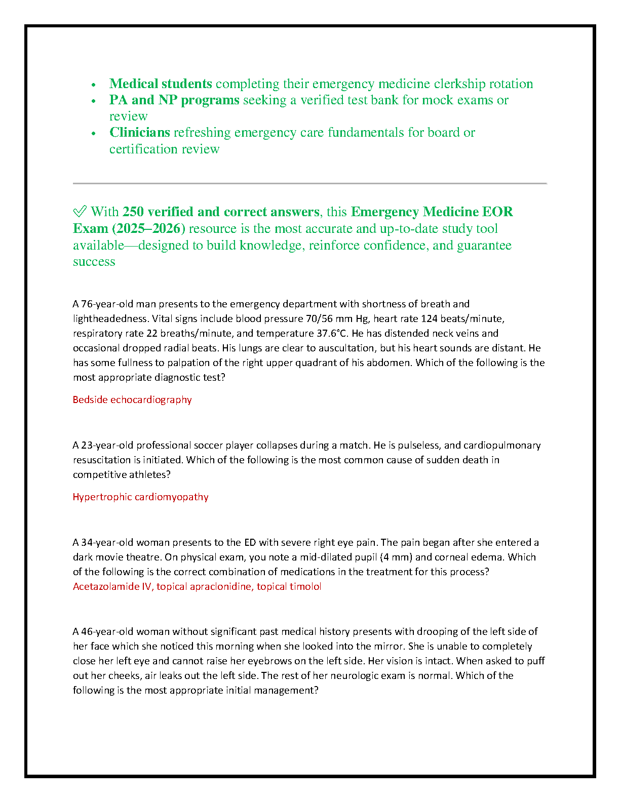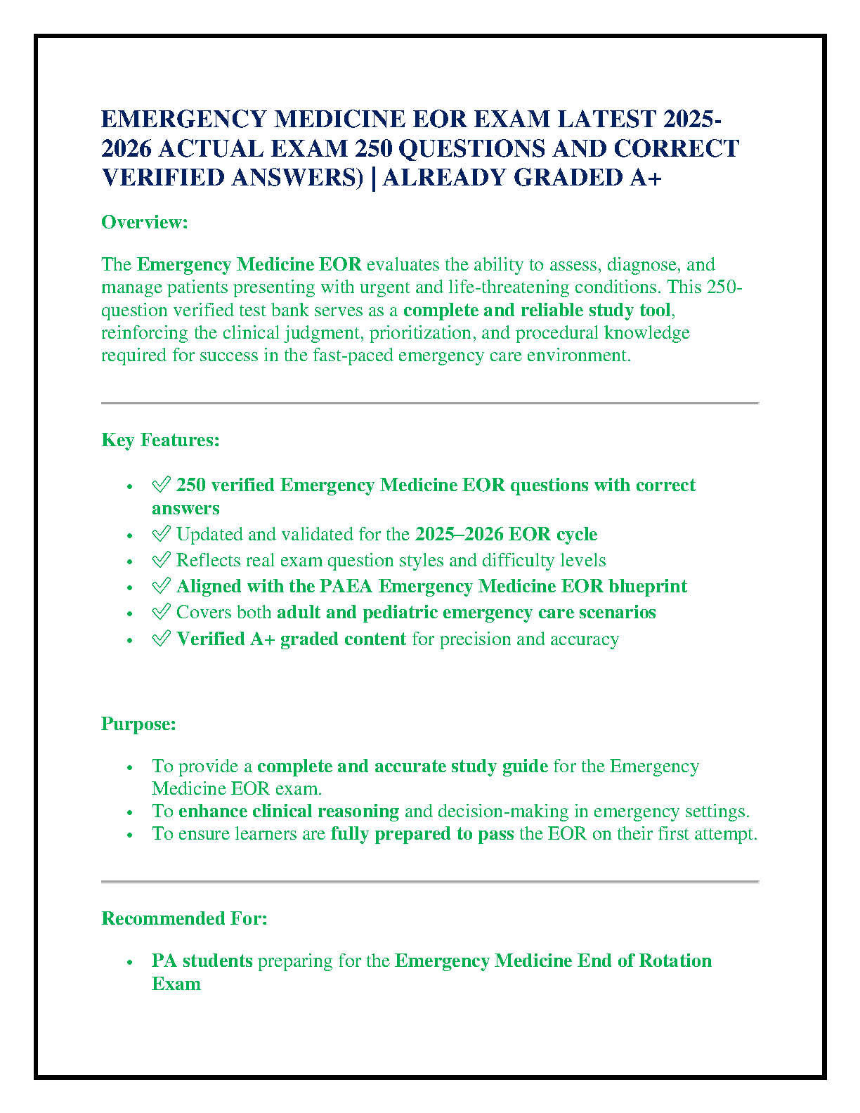 Master the PAEA Emergency Medicine EOR 2025-2026: Test Bank with 250 A+ Graded Questions & Detailed Answers