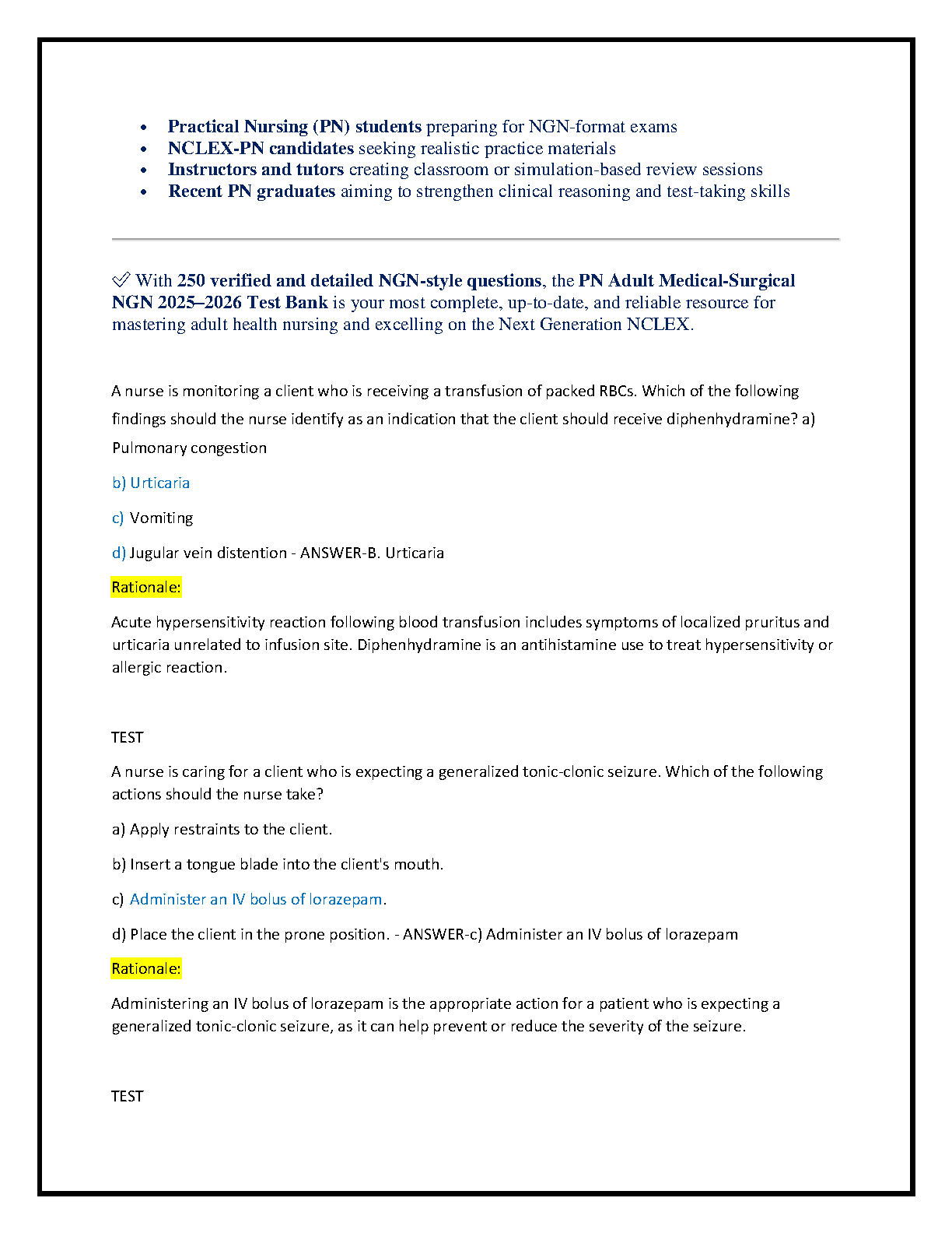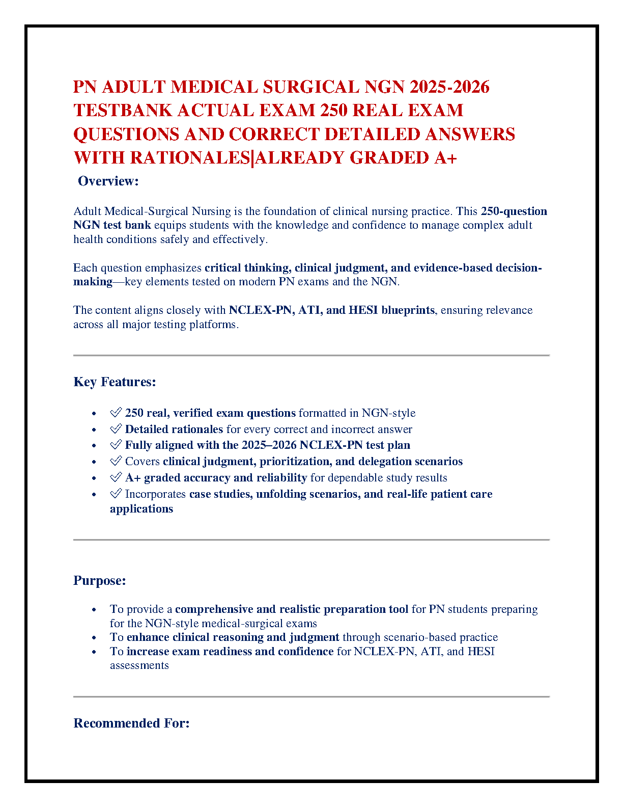 Master the fundamentals of Adult Medical-Surgical Nursing with our comprehensive NGN Test Bank for the 2025-2026 academic year. This A+ graded resource is meticulously designed to prepare PN students for success on the NCLEX-PN, ATI, and HESI exams. It features 250 real, NGN-style exam questions, each accompanied by detailed rationales for both correct and incorrect answers. Deepen your understanding of critical thinking, clinical judgment, and evidence-based practice through realistic case studies, unfolding scenarios, and questions covering prioritization and delegation. Fully aligned with the latest 2025-2026 NCLEX-PN test plan, this test bank is your ultimate tool to build confidence, enhance clinical reasoning, and pass your exams on the first attempt.