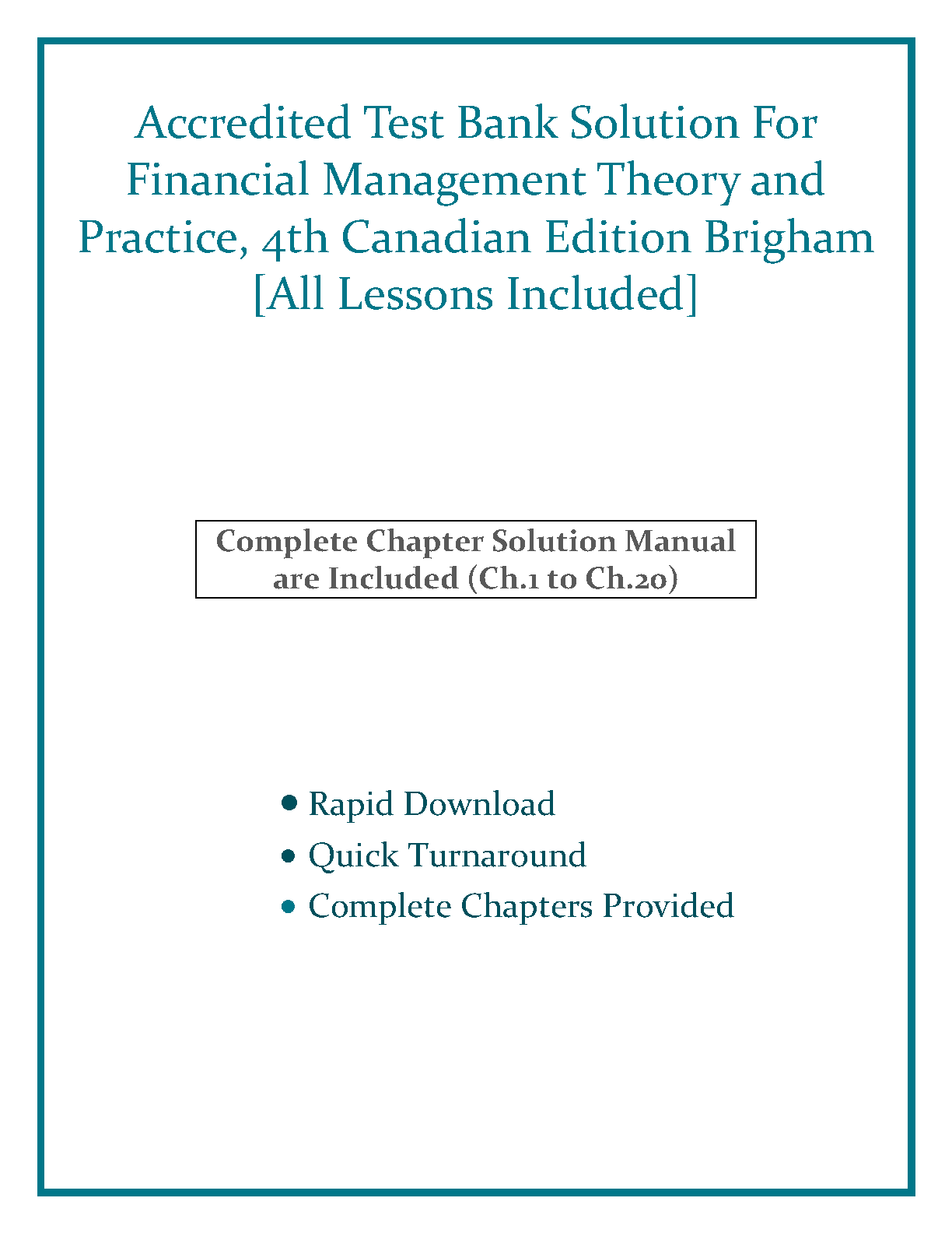 Unlock your academic potential with the complete Test Bank and Solution Manual for Financial Management: Theory and Practice, 4th Canadian Edition. This comprehensive resource covers all 20 chapters, providing you with detailed, step-by-step solutions to textbook problems and a vast collection of exam-style questions with answers. Master complex financial concepts, streamline your study process, and confidently prepare for exams. Available for instant download, this guide is your key to understanding course material and achieving top grades.