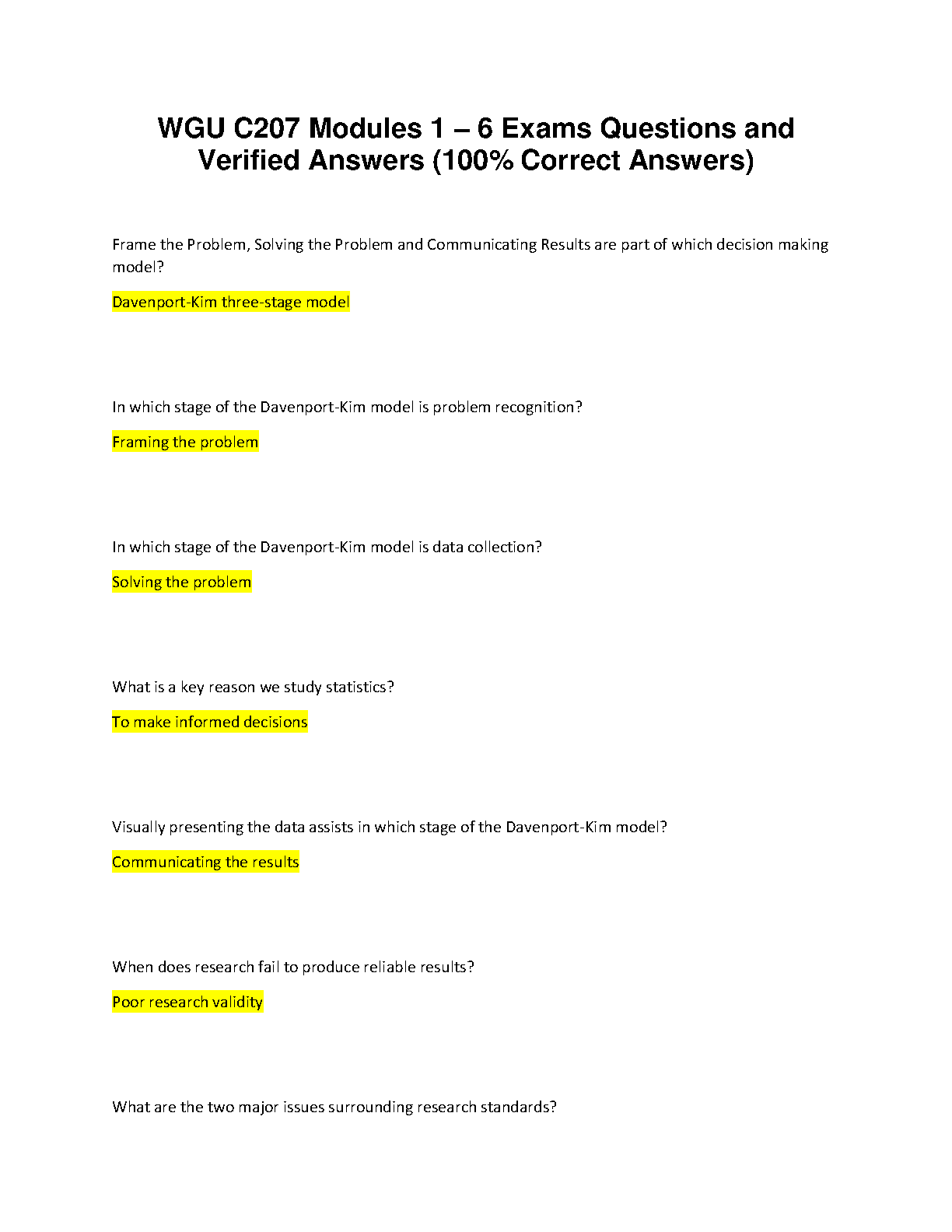 Ace your WGU C207 Data-Driven Decision Making course with this comprehensive test bank covering Modules 1 through 6. This essential study guide features a complete set of exam questions with 100% verified and correct answers. Deepen your understanding of core concepts like the Davenport-Kim three-stage model, statistical analysis, and research validity. This resource is expertly crafted to help you master the material, build confidence, and pass your exams on the first attempt.
