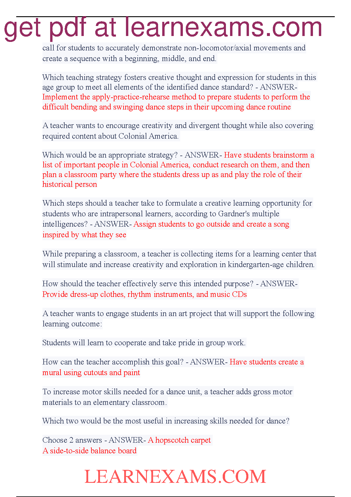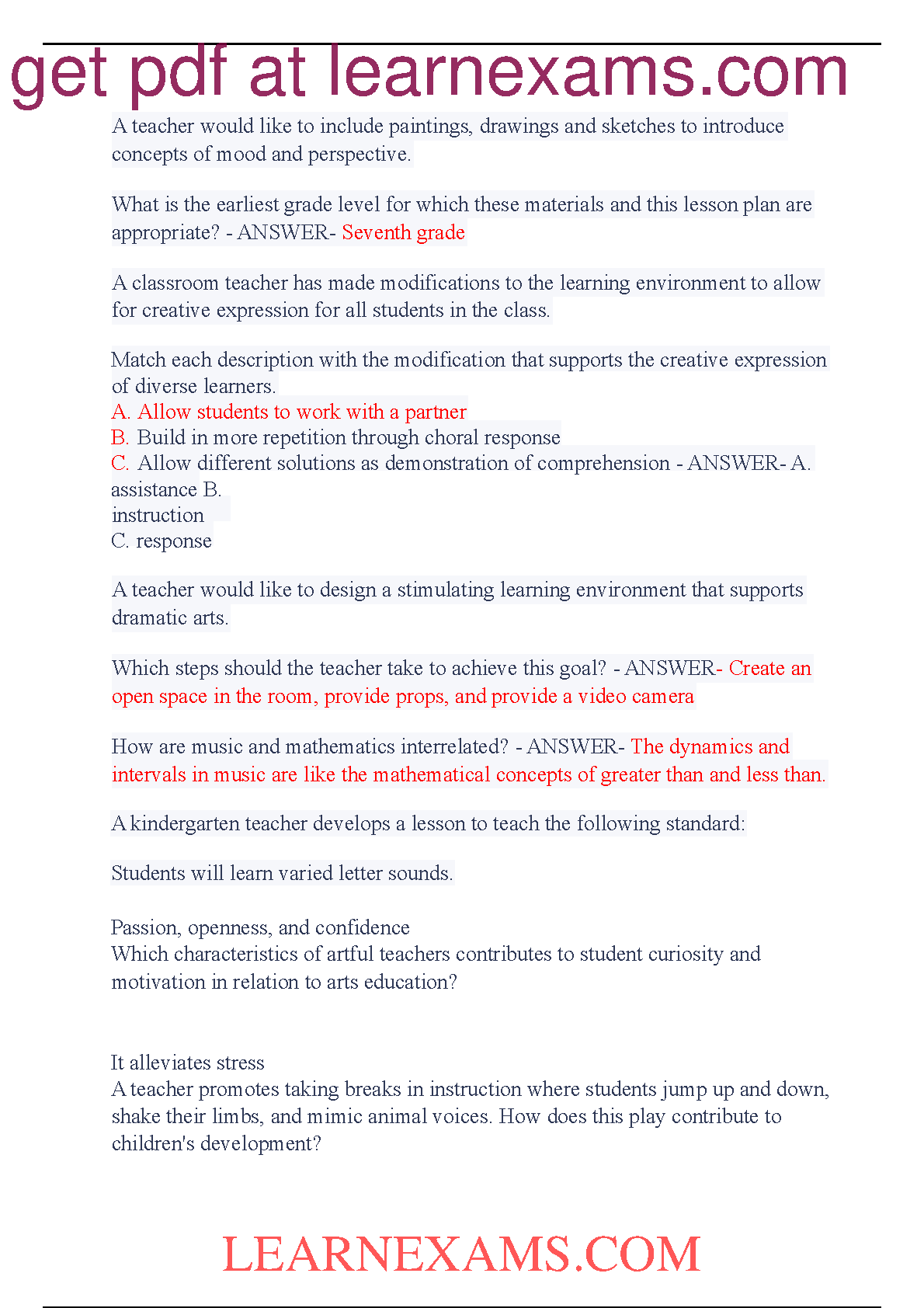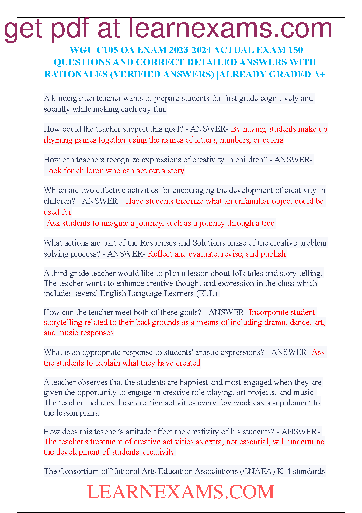 Struggling with the WGU C105 Introduction to the Arts OA? Eliminate exam anxiety with our latest 2025/2026 study guide! This comprehensive resource features 150 actual exam questions, each paired with a correct, detailed answer and rationale. All answers have been verified and graded A+, ensuring you study the most accurate and relevant material. Master key concepts including fostering creativity in young learners, integrating arts into the curriculum, and creative problem-solving. This guide is your ultimate tool to pass the WGU C105 exam on your very first try. Download now and secure your A!