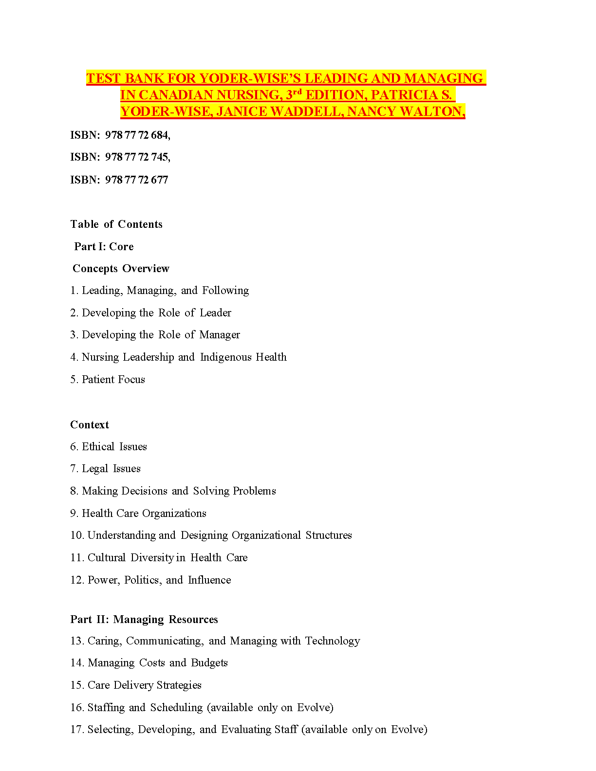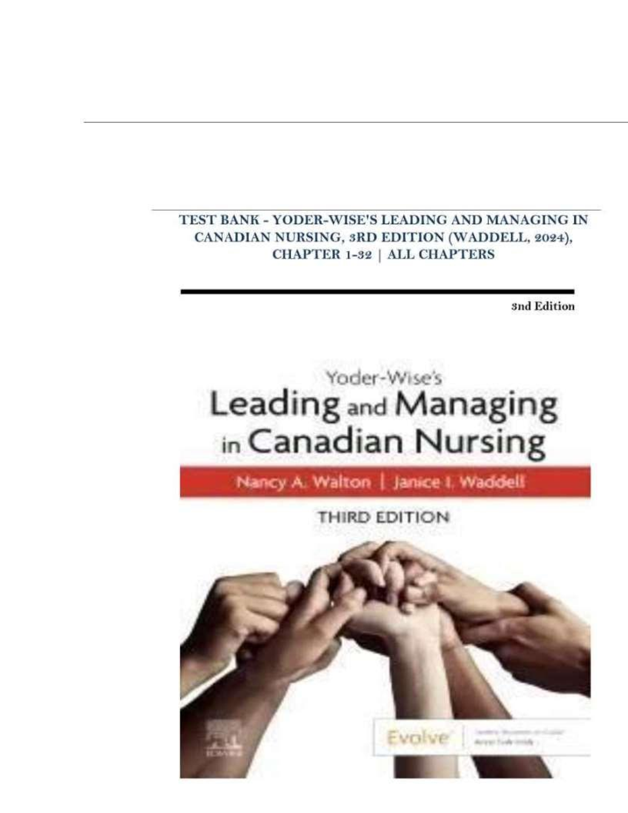 Access the complete Test Bank for the 3rd Edition of Yoder-Wise's Leading and Managing in Canadian Nursing by Yoder-Wise, Walton, and Waddell. This essential study guide contains a comprehensive collection of practice questions and answers covering all 32 chapters. Ideal for exam preparation, it helps you master core concepts in nursing leadership and management within the Canadian healthcare system, ensuring you're fully prepared for your tests.