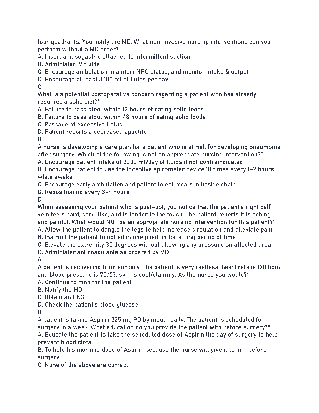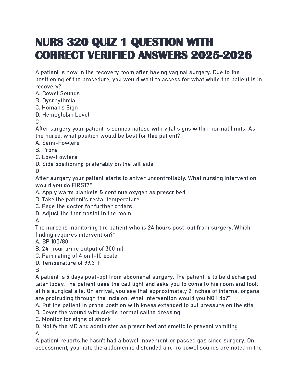 Get ready to ace your exam with the NURS 320 Quiz 1 Test Bank for the 2025/2026 academic year. This essential study guide provides a complete set of questions with 100% correct, verified answers, covering critical topics in post-operative nursing care. You'll master key areas such as post-surgical patient assessment, optimal positioning, management of common complications like shivering, and recognizing urgent findings that require immediate intervention. This resource is expertly designed to help you prepare effectively, boost your confidence, and pass your exam on the first attempt.
