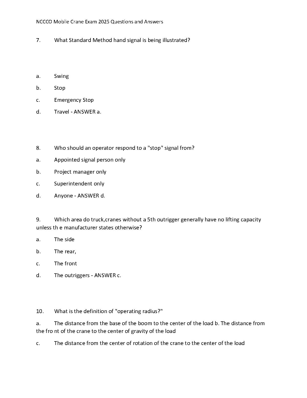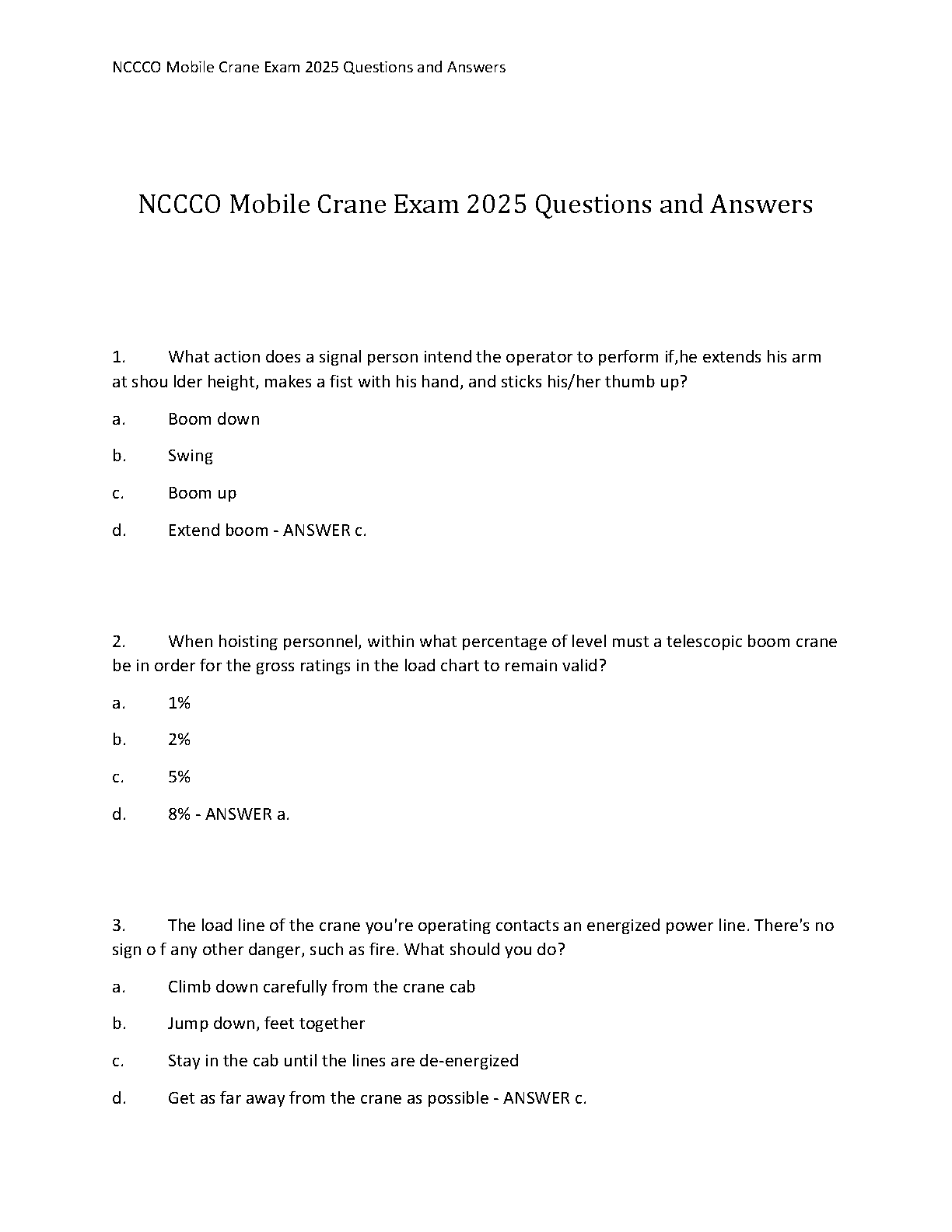 Get ready to pass your NCCCO Mobile Crane Operator certification exam on the very first try! This comprehensive test bank for the 2025 exam is your ultimate study resource, packed with the latest, most relevant practice questions and detailed, verified answers. Master crucial topics including standard hand signals, load chart calculations, and critical safety protocols like handling power line contact. Designed for the 2025/2026 testing cycle, this guide is engineered to help you build the confidence and knowledge needed to ace your exam, avoiding costly resits. Secure your certification with the best prep material available!