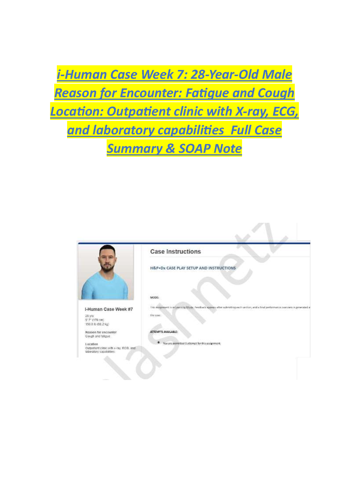 Ace your studies with this complete guide for the i-Human Case Week 7, featuring a 28-year-old male presenting with fatigue and cough. This newly updated 2025/2026 resource provides a full case summary and a meticulously crafted SOAP note. It is the ultimate study aid designed to help you navigate the virtual patient encounter, hone your diagnostic skills, and secure a top grade. Download now to ensure you pass your assessment on the very first attempt and avoid any resits.