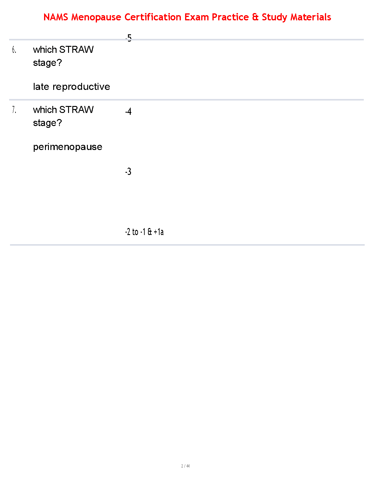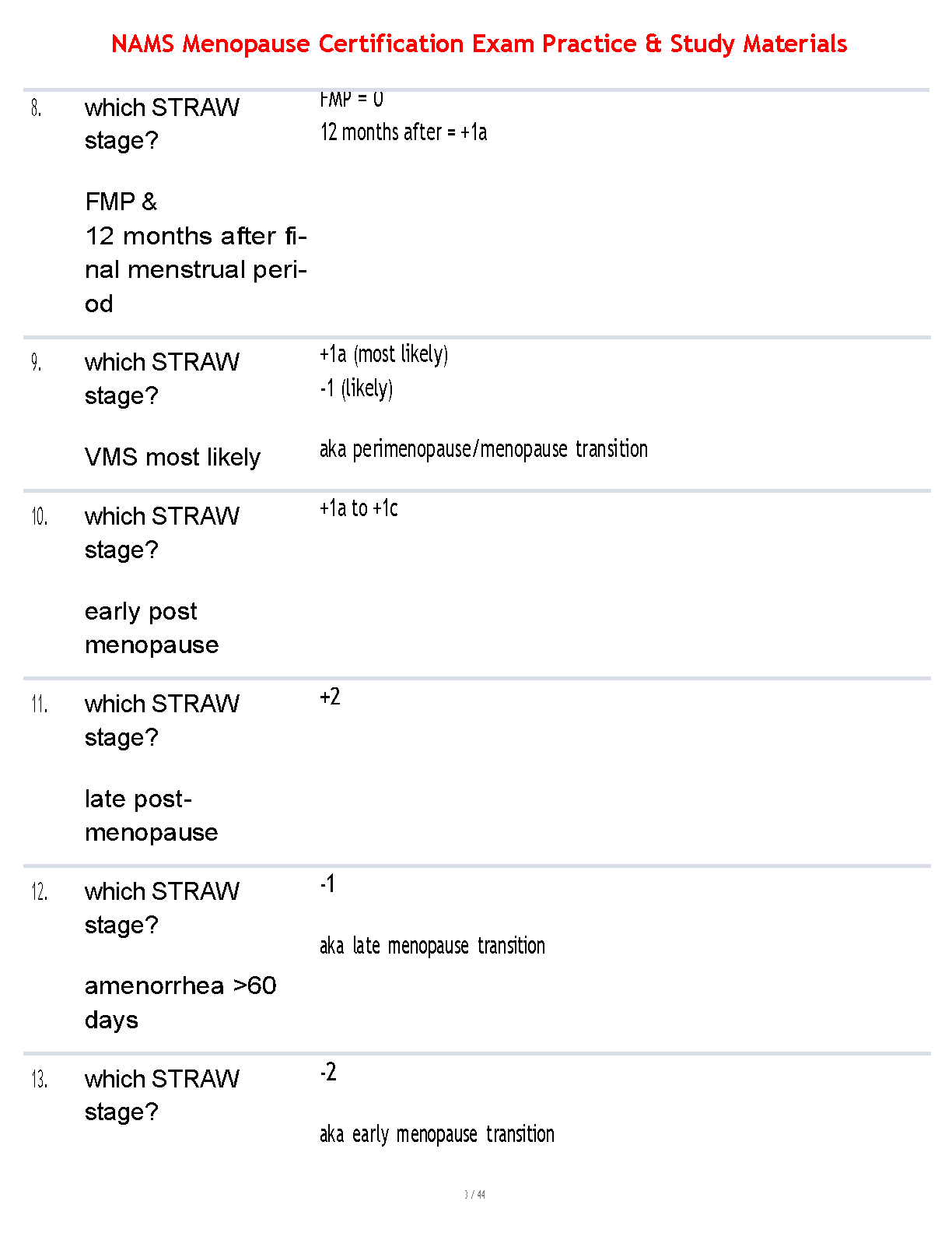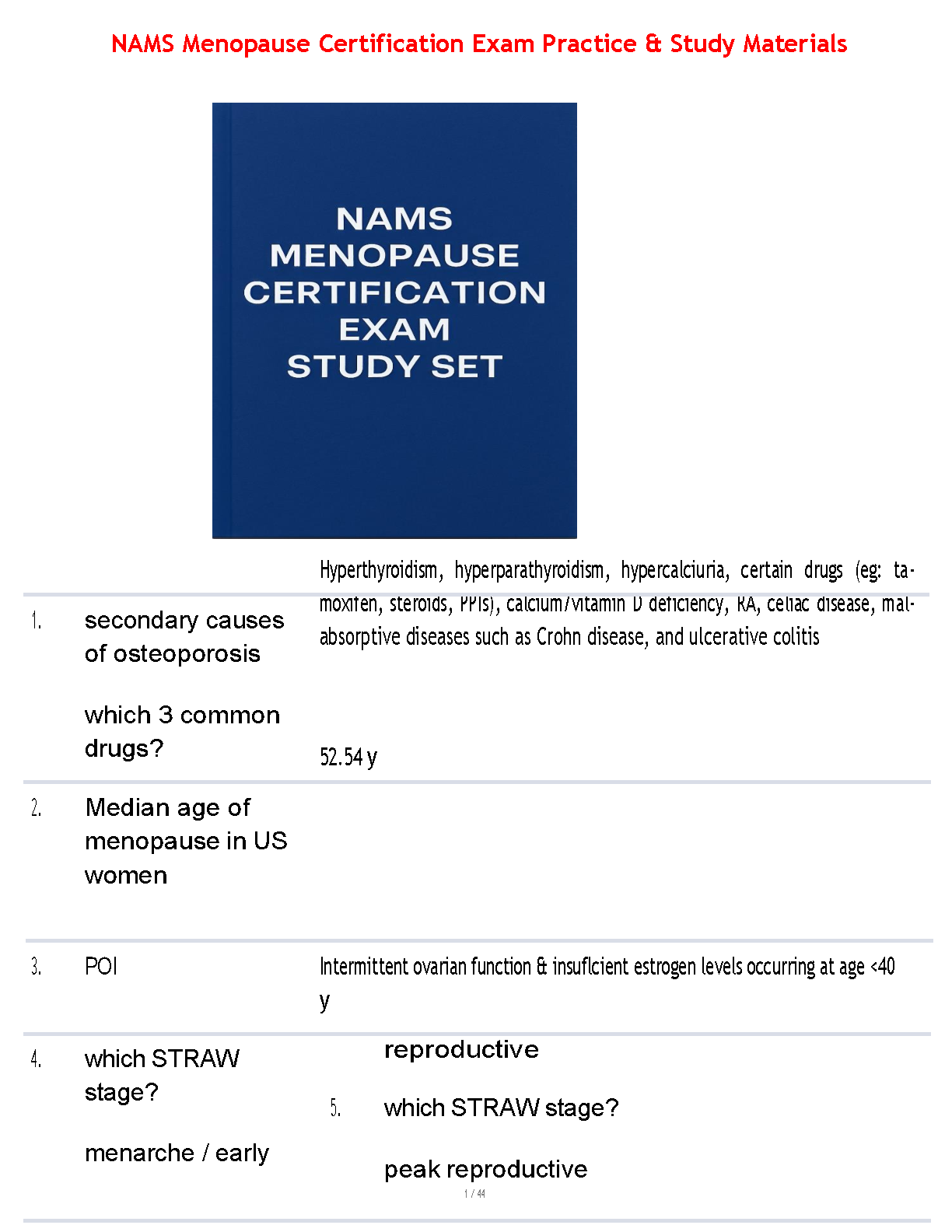 Master the NAMS Menopause Certification Exam with our comprehensive Test Bank and Study Set, updated for the latest exam curriculum. This essential resource, developed by The North American Menopause Society (NAMS), provides a complete collection of practice questions and verified answers covering all key topics, including secondary causes of osteoporosis, STRAW staging, primary ovarian insufficiency (POI), and more. Designed for healthcare professionals seeking certification, this study guide is your ultimate tool to build confidence, identify knowledge gaps, and ensure you pass the exam on your first attempt. Get immediate access to the materials and start preparing for your NAMS certification today!