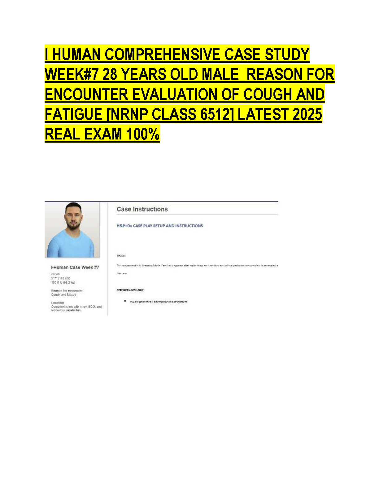 Unlock a perfect score on your i-Human assessment with our comprehensive guide for the NRNP 6512 Week 7 case study. This resource provides a detailed walkthrough of the evaluation of a 28-year-old male patient presenting with symptoms of cough and fatigue. Updated for the 2025/2026 academic year, this guide includes all the correct H&P, Dx, and case play setups to ensure you achieve 100%. Master the key concepts, avoid common pitfalls, and pass your exam on the first attempt with confidence. Essential for students aiming to excel in their NRNP program and avoid resits.