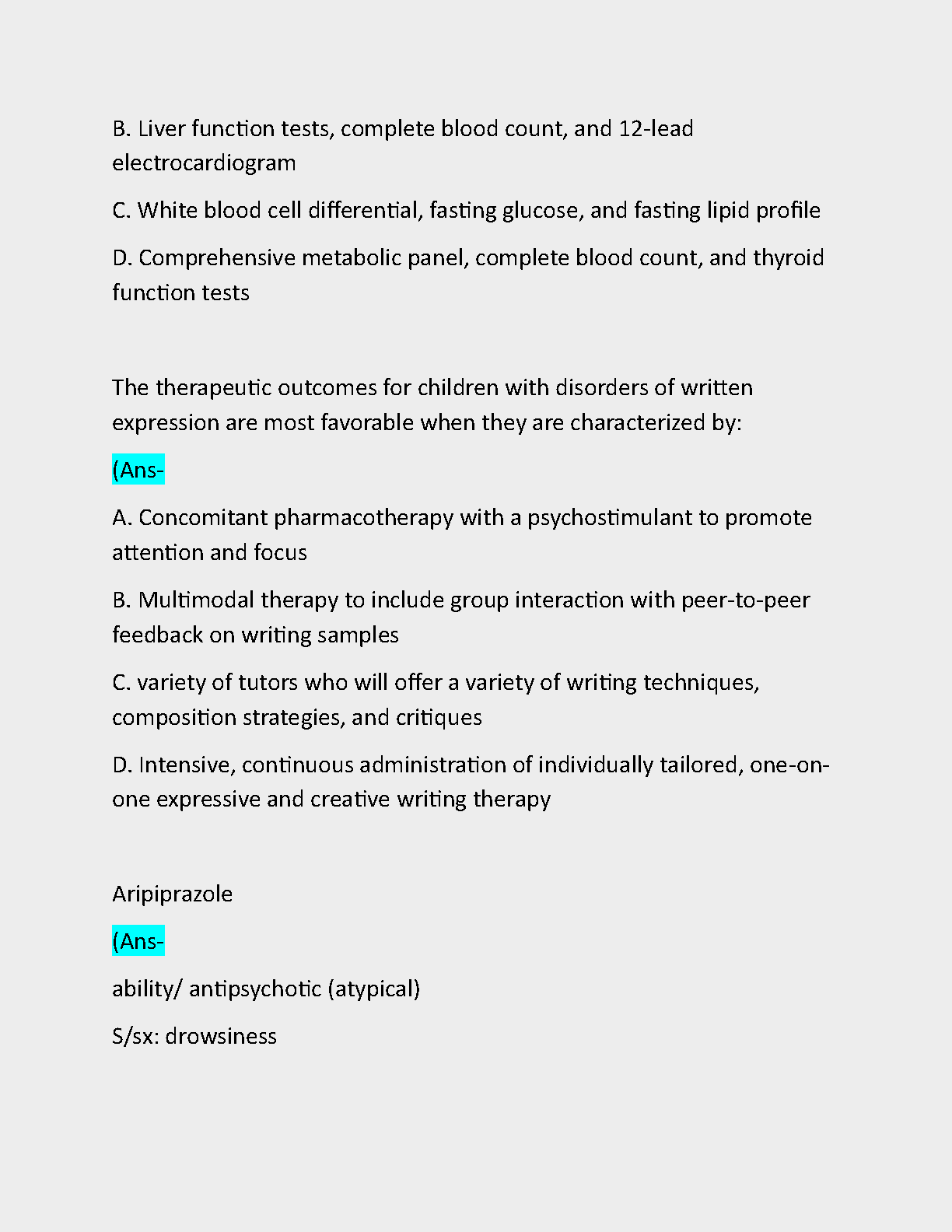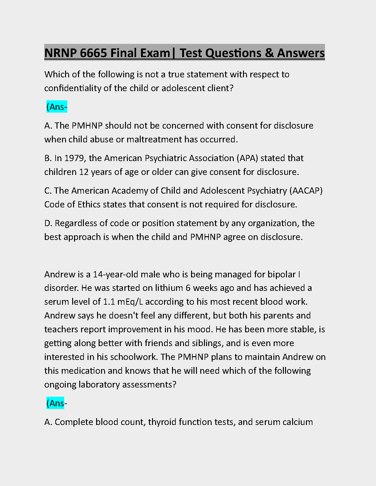 Ace your NRNP 6665 final exam with confidence! This is a complete and meticulously compiled test bank for the course, specifically designed to help you master the final exam. It features an extensive collection of real exam-style questions, each paired with a correct, verified answer. The content covers all key topics, including psychotherapy principles, patient assessment, and ethical considerations. By studying with this guide, you'll gain a deep understanding of the material and walk into your exam fully prepared to succeed. This is the ultimate study tool to help you pass on your first attempt and excel in your PMHNP program.