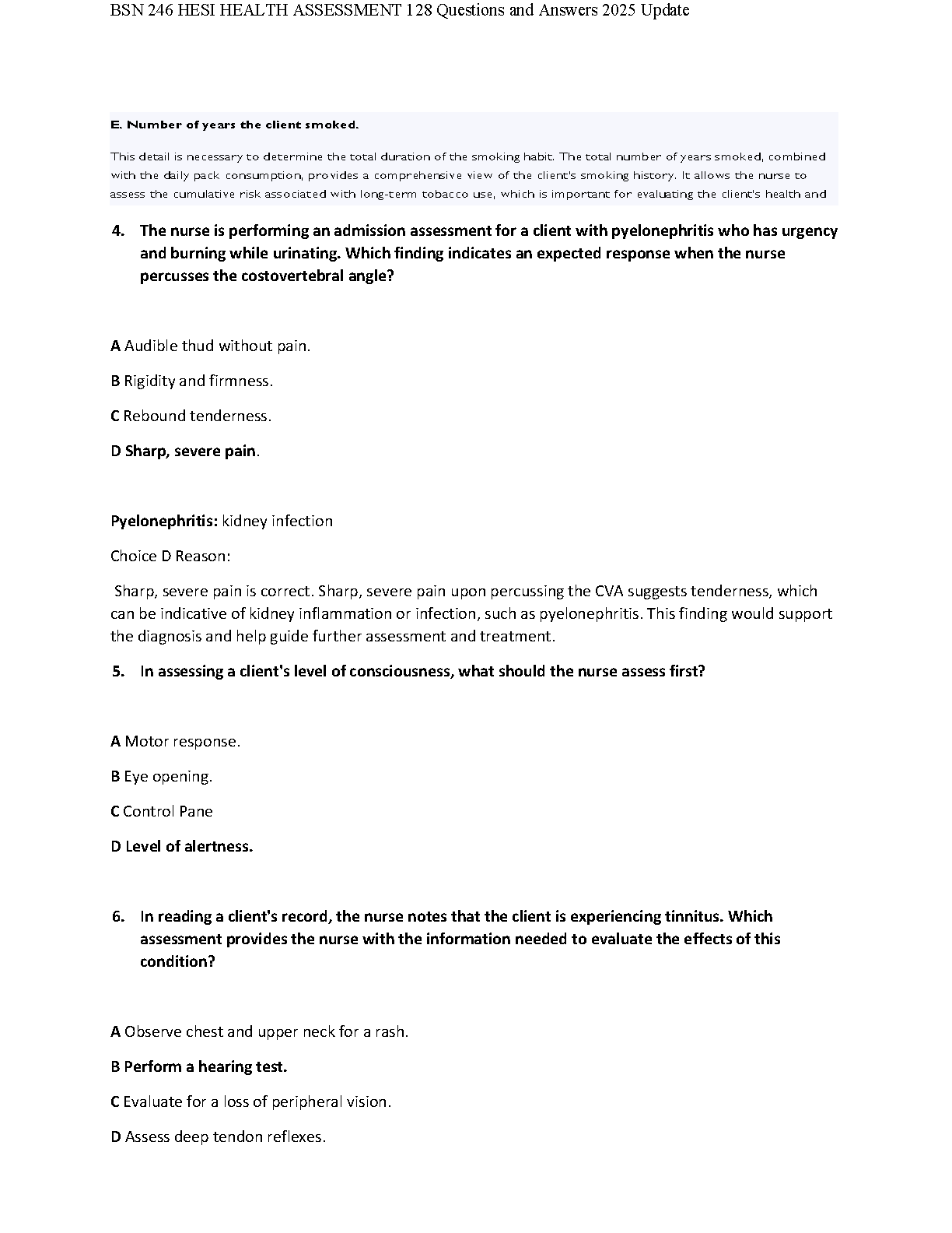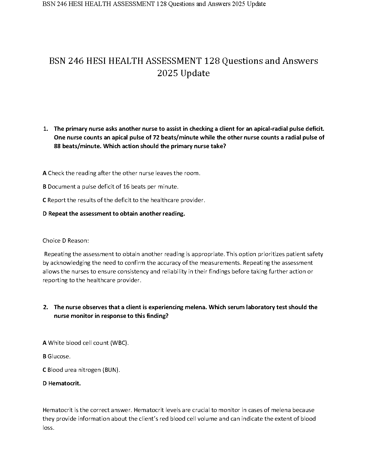 Struggling with HESI Health Assessment? Ace your BSN 246 exam on the first attempt with our comprehensive and fully updated 2025/2026 test bank. This essential study guide is designed to give you the confidence and knowledge you need to succeed. Inside, you'll find 128 meticulously curated practice questions, complete with correct answers and in-depth rationales. Stop guessing and start understanding the core concepts of health assessment. This resource is your key to mastering the material, identifying your weak spots, and walking into your exam fully prepared. Download now and avoid the stress of resits!