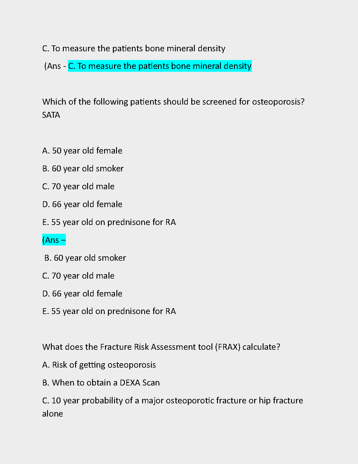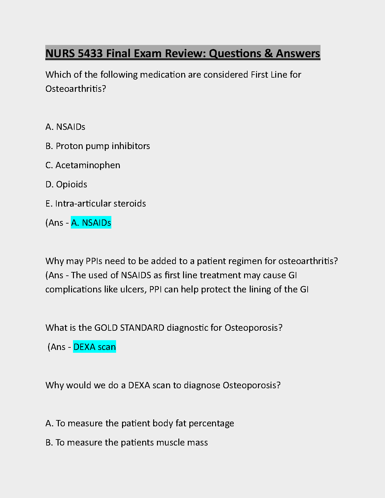 Ace your NURS 5433 final exam with our comprehensive review guide, updated for the 2025/2026 academic year. This essential resource features a detailed collection of questions and expertly verified answers, covering critical topics such as the management of Osteoarthritis and Osteoporosis, first-line treatments like NSAIDs, and diagnostic standards like DEXA scans. Designed to streamline your study process, this guide helps you master key concepts and boosts your confidence to pass your final exam on the first try, eliminating the need for resits. Get the edge you need for success in your nursing program.