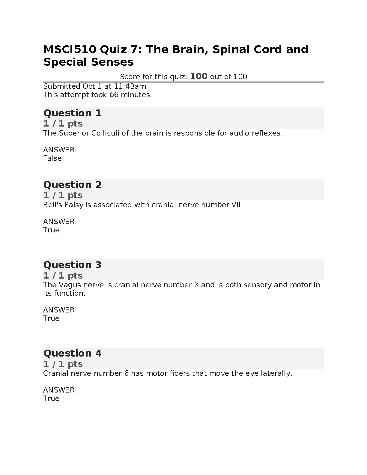 Get the ultimate edge in your MSCI510 course with this comprehensive study guide for Quiz 7, focusing on The Brain, Spinal Cord, and Special Senses. This resource provides 100% correct and verified answers, as demonstrated by the perfect score. Updated for the 2025/2026 academic year, this guide is meticulously crafted to help you master complex topics like cranial nerves, brain functions, and sensory pathways. Say goodbye to exam stress and avoid resits by using these proven answers to study effectively and pass on your first try.