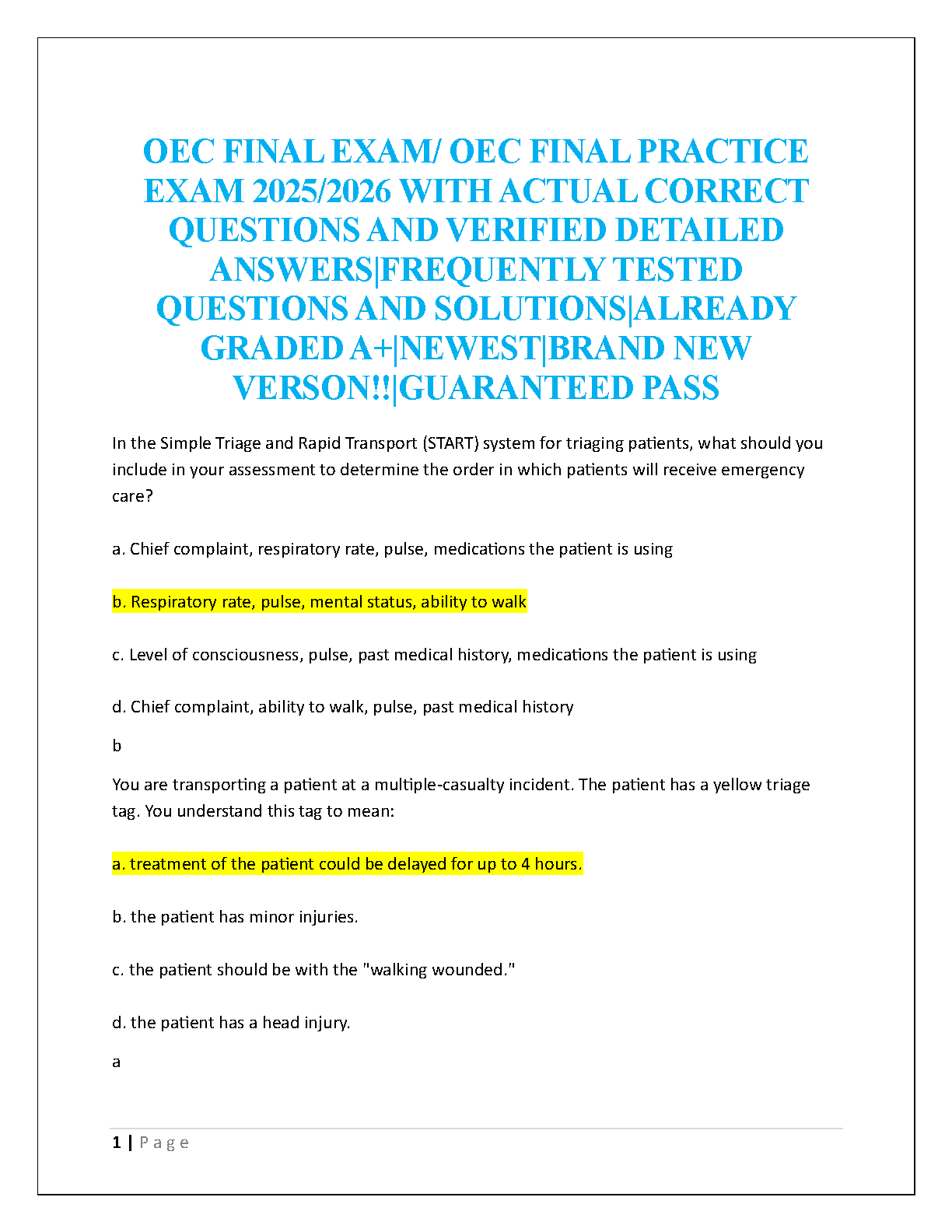 Master the Outdoor Emergency Care (OEC) final exam with our comprehensive test bank for the 6th Edition textbook by David Johe, Rob D. Gilliom, and Jeffrey E. Isaac. This up-to-date resource for the 2025/2026 academic year features a collection of frequently tested questions, complete with verified and detailed answers. Each question is designed to reflect the actual exam format, covering key topics like START triage and patient assessment. Achieve an A+ grade and pass your OEC certification on the first try with this guaranteed-to-pass study guide. Avoid resits and build your confidence with the newest and most accurate practice questions available.