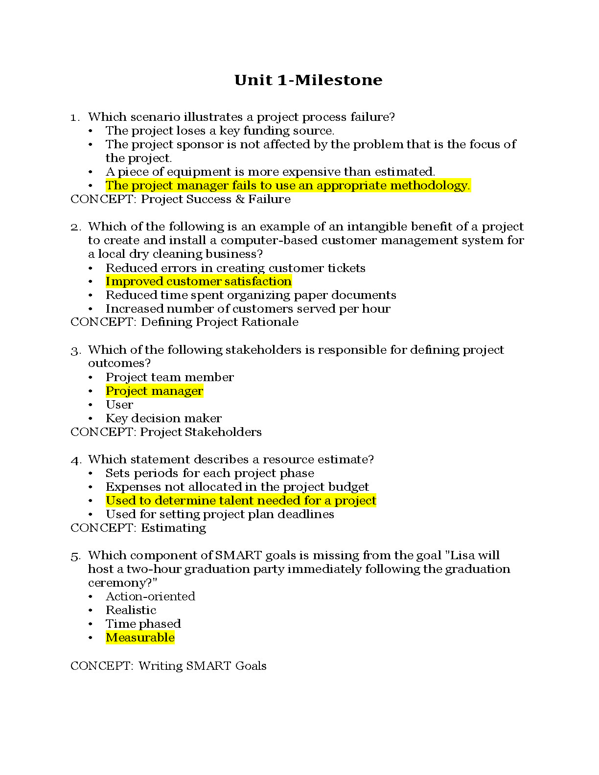Ace your Straighterline Project Management course with our verified test bank for the Unit 1 Milestone exam. This essential study guide features a complete collection of questions with highlighted, 100% correct answers. It covers all core concepts from the unit, including Project Success & Failure, Defining Project Rationale, Project Stakeholders, Resource Estimating, and Writing SMART Goals. Designed to help you study efficiently and confidently, this resource is your key to passing the exam on your first attempt and securing a top grade.