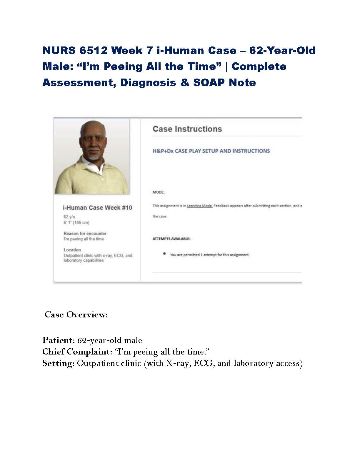 Ace your NURS 6512 course with this comprehensive guide for the Week 7 i-Human case study featuring a 62-year-old male presenting with the chief complaint 'I'm peeing all the time.' This newly updated 2025/2026 resource provides a complete walkthrough, including a detailed patient assessment, accurate diagnosis, and a perfectly formatted SOAP note. It's the ultimate study tool designed to help you master the i-Human simulation and pass your exams with confidence on your very first attempt, eliminating the need for resits. Download now for guaranteed success!