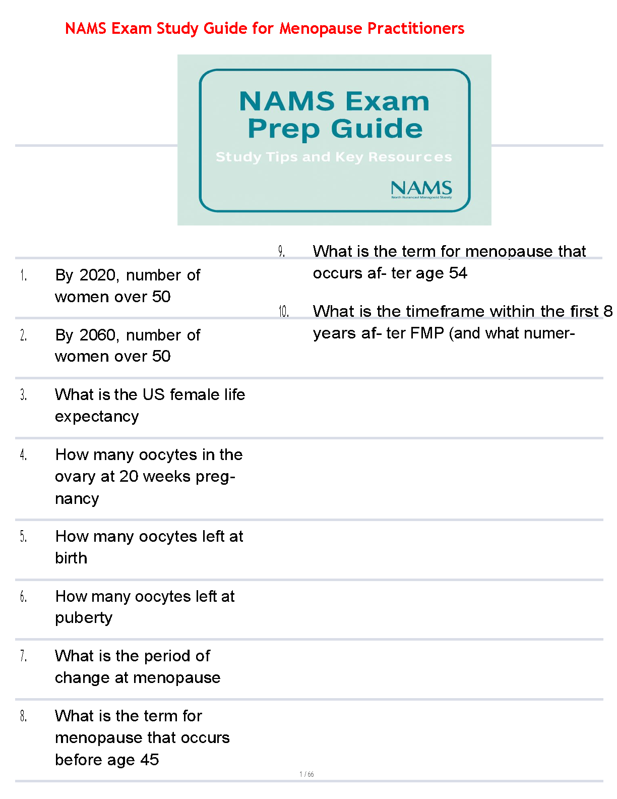 Prepare to excel on the NAMS Certified Menopause Practitioner (NCMP) Exam with this complete Test Bank. Sourced directly from the official textbook, 'Menopause Practice: A Clinician's Guide, 6th Edition' by Nanette Santoro and JoAnn V. Pinkerton, this study aid provides a vast collection of questions and answers. It covers every essential topic, from the physiology of menopause to the latest clinical guidelines and treatment options. This resource is expertly designed to test your knowledge, pinpoint areas for improvement, and ensure you have the confidence and expertise to pass your certification exam with flying colors.