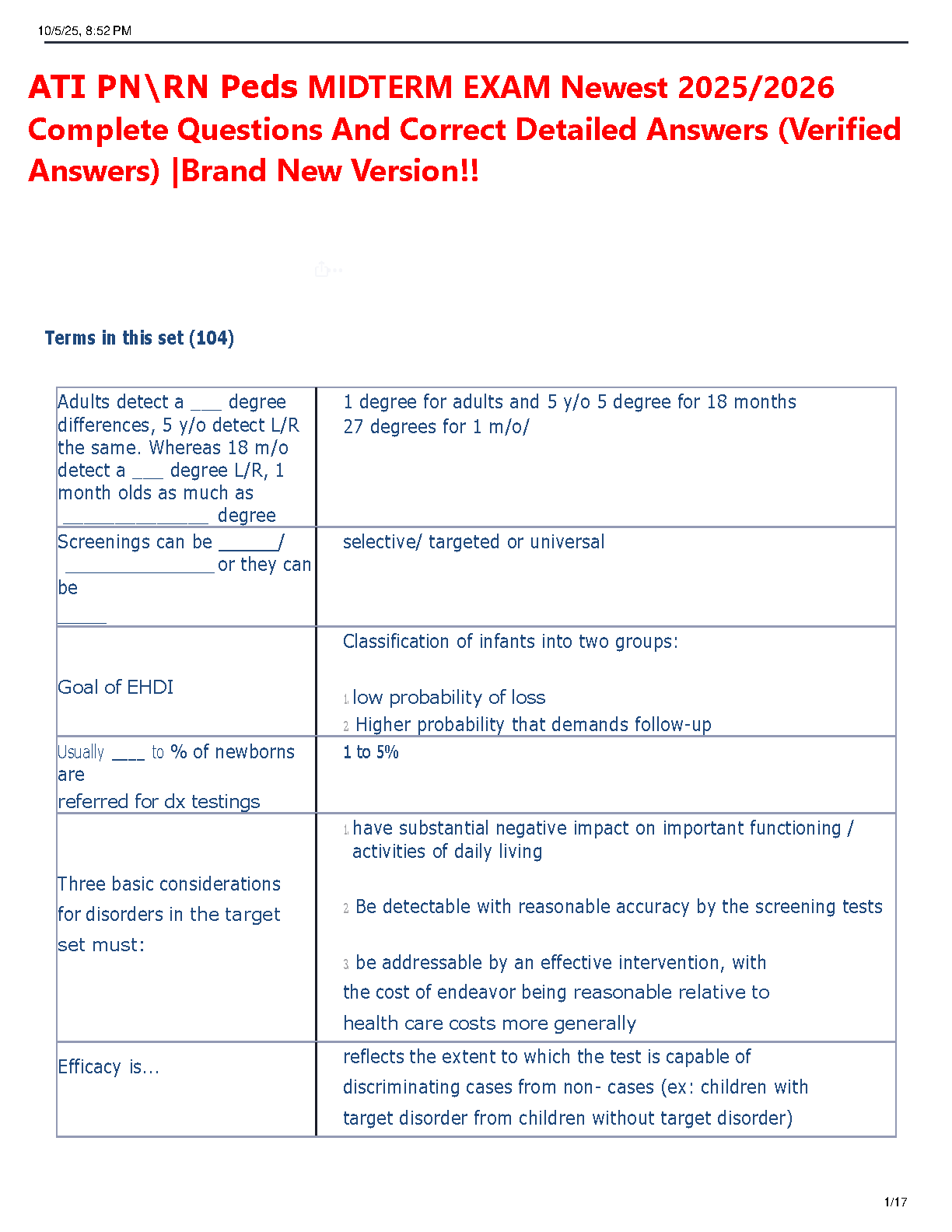 Ace your upcoming ATI Pediatrics Midterm Exam with this comprehensive and newly updated test bank for the 2025/2026 academic year. Designed specifically for both PN and RN nursing students, this study guide features a complete set of questions, each paired with a correct, detailed, and verified answer. This resource covers all the essential topics you'll face on the Peds Midterm, ensuring you have the knowledge and confidence to pass on your very first try. Stop worrying about resits and start studying smarter with our brand new, top-rated ATI Peds exam prep material.