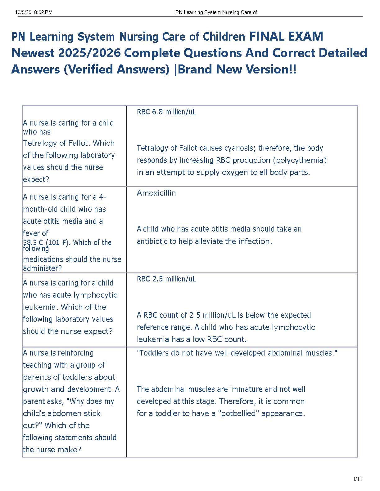Ace your pediatric nursing final with our latest 2025/2026 Test Bank for the PN Learning System: Nursing Care of Children. This comprehensive resource is expertly designed to help you pass your exam on the first attempt and avoid costly resits. It features a complete collection of verified questions that mirror the actual final exam, each accompanied by detailed, easy-to-understand answers and rationales. Master key concepts, from Tetralogy of Fallot to common childhood illnesses, and build the confidence you need to succeed. Download now and take the first step towards acing your final!