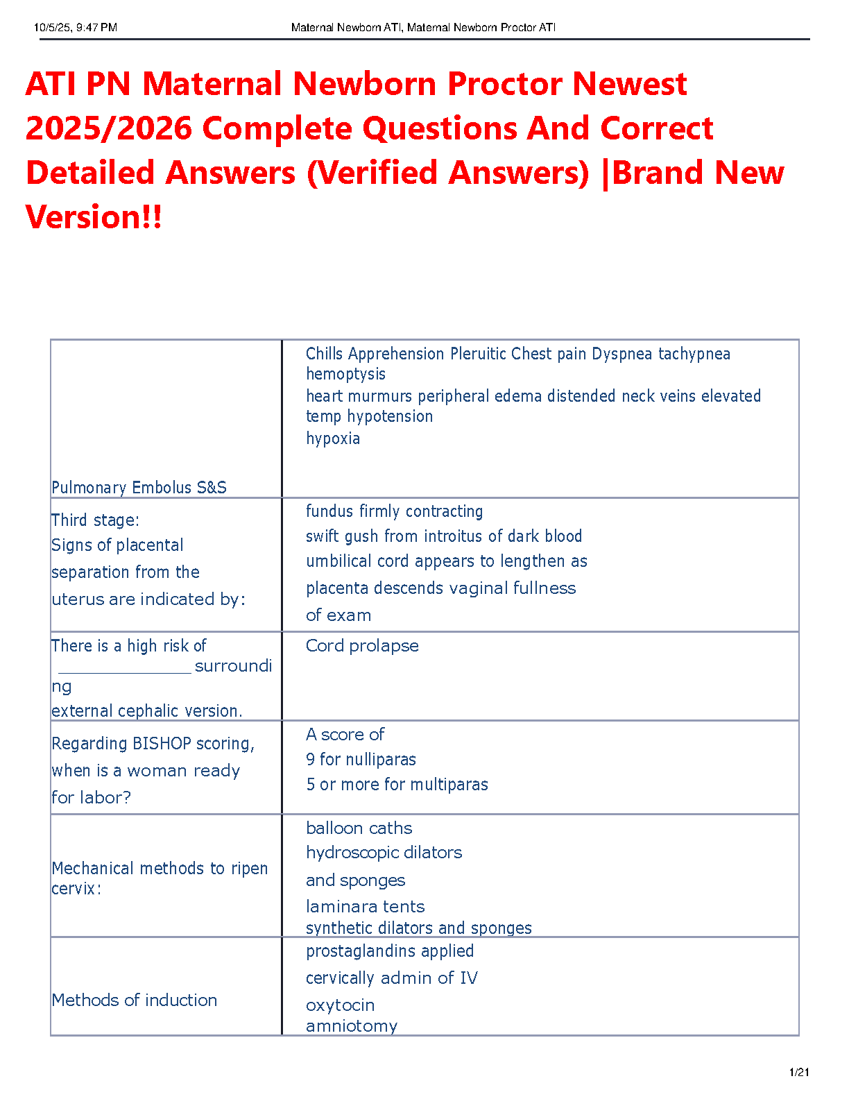 Master the ATI PN Maternal Newborn Proctor exam with our brand-new, comprehensive study guide for the 2025-2026 academic year. This resource is packed with a full set of questions and meticulously detailed, verified answers to ensure you have the knowledge and confidence to pass on your first try. Dive deep into crucial topics such as signs and symptoms of a pulmonary embolus, stages of labor, placental separation indicators, BISHOP scoring for labor readiness, methods for cervical ripening, and induction procedures. Avoid resits and achieve success with this essential tool for your nursing studies.