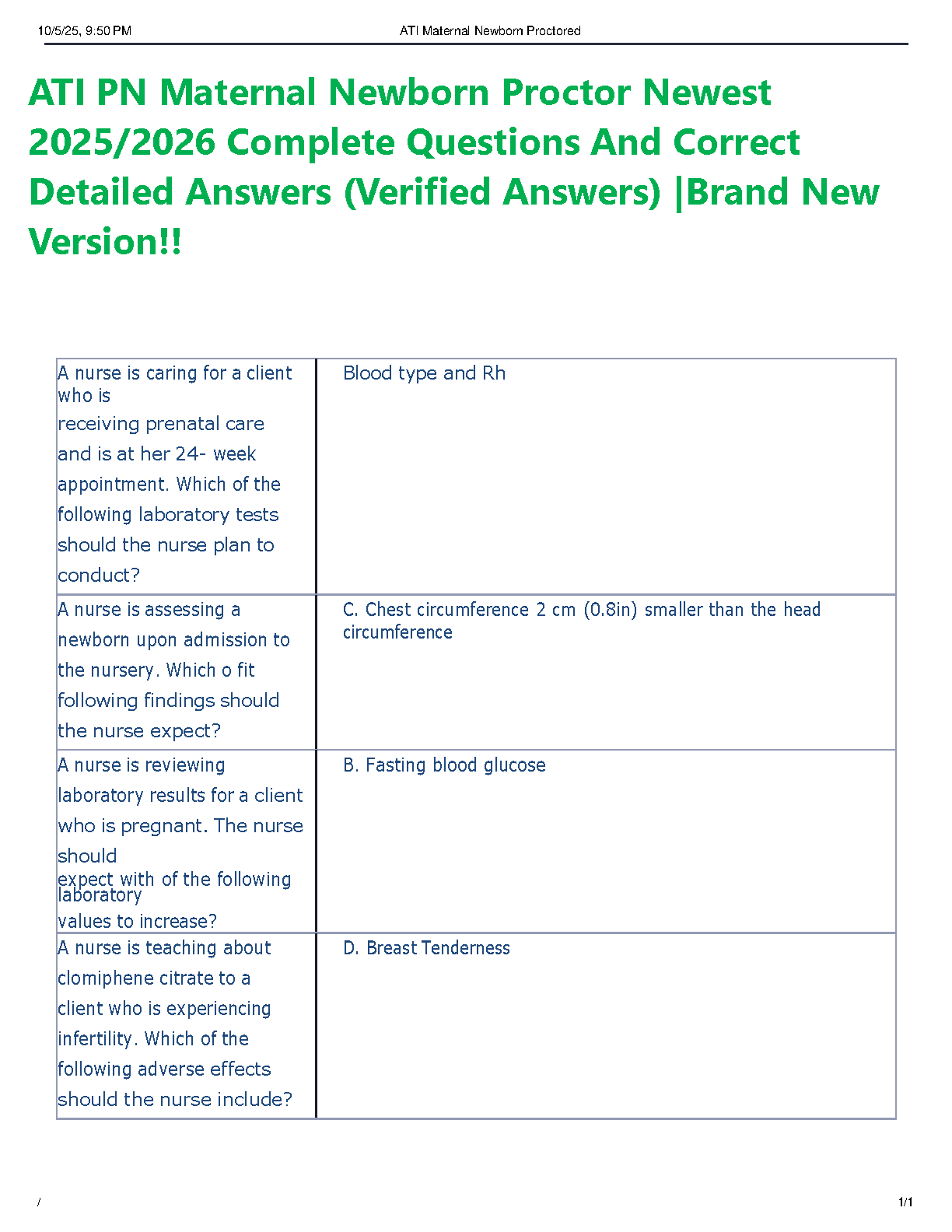 Ace your nursing exams with our latest 2025/2026 ATI PN Maternal Newborn Proctor Test Bank. This comprehensive study guide features a complete collection of questions paired with detailed, verified answers to ensure you have the most accurate and up-to-date information. Designed specifically for practical nursing students, this resource covers all key topics in maternal and newborn care, helping you master the material, build confidence, and pass your proctored exam on the first try. Avoid resits and achieve your academic goals with this essential preparation tool.