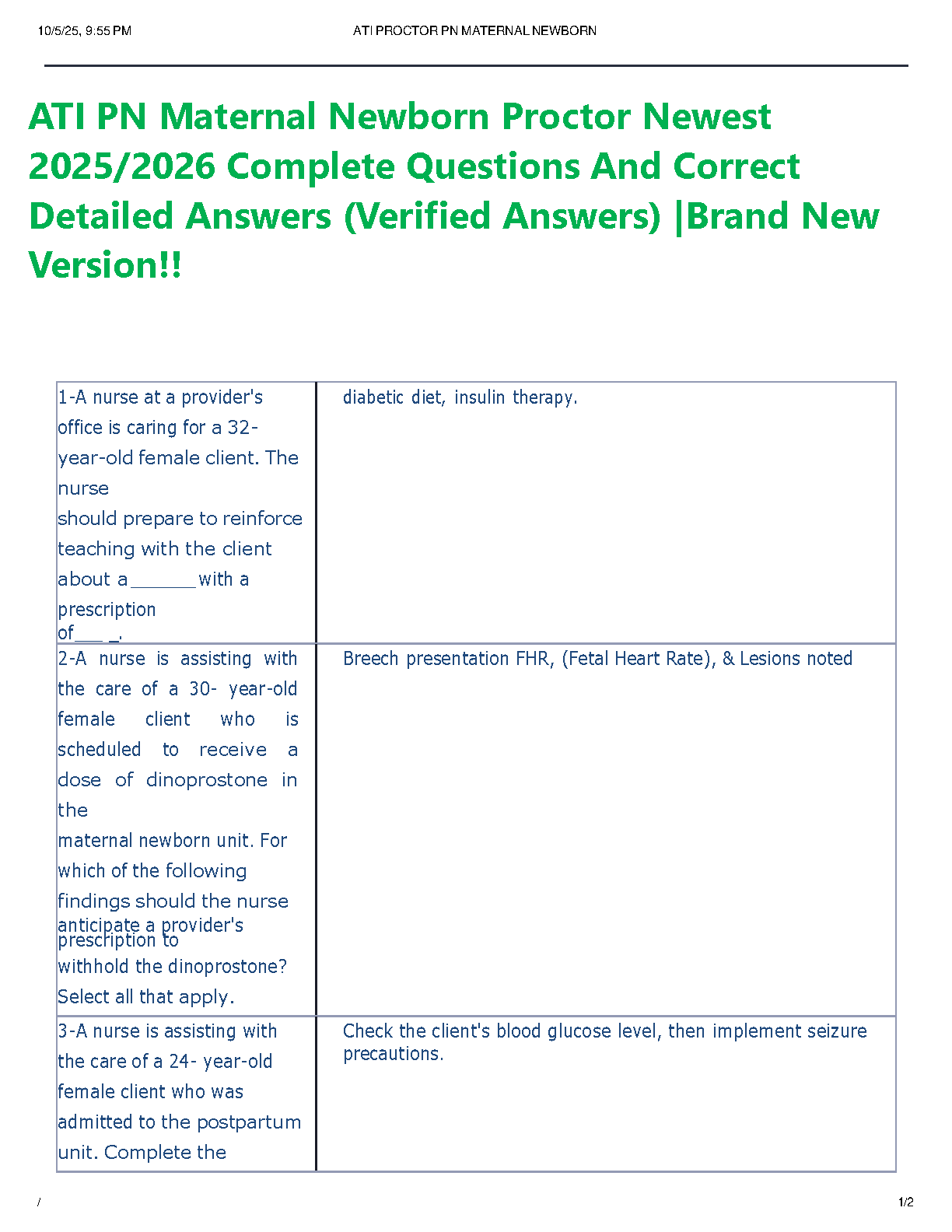 Prepare to excel in your nursing studies with the latest ATI PN Maternal Newborn Proctor Exam Test Bank for the 2025/2026 academic year. This comprehensive resource is packed with a complete collection of exam questions, each paired with correct, verified, and detailed answers. Designed to mirror the actual proctored exam, this study guide provides you with the essential knowledge and practice needed to master maternal and newborn care concepts. Boost your confidence and achieve a top score on your first attempt!