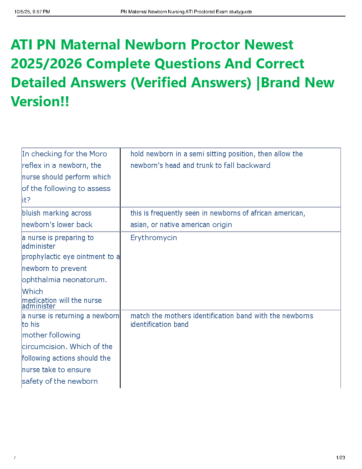 Ace your ATI PN Maternal Newborn Proctored Exam with our latest 2025/2026 study guide! This comprehensive resource is packed with a complete set of questions and meticulously verified, detailed answers to cover every key concept. Designed specifically to help nursing students master the material, this guide is your key to understanding complex topics, building confidence, and passing the exam on your very first attempt. Stop worrying about resits and start preparing for success. Get the Brand New Version today and secure your high scores!