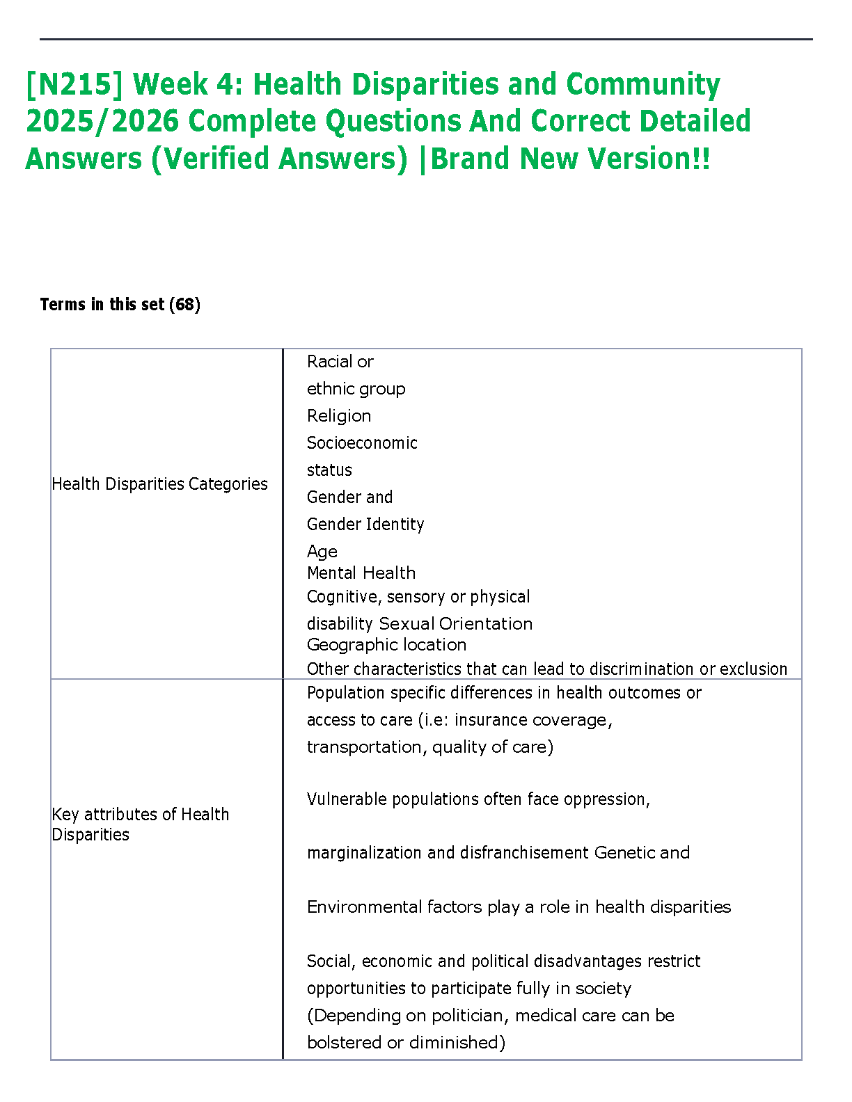 Ace your N215 Week 4 exam on Health Disparities and Community Health with this comprehensive study guide. This resource features a complete set of 68 questions and detailed, verified answers for the 2025/2026 academic year. Master key concepts such as the categories and attributes of health disparities, including factors like socioeconomic status, geographic location, and access to care. Designed to help you understand the core material thoroughly, this guide provides the clarity and confidence you need to pass your exam on the first attempt and avoid resits. Get the brand new version and start studying smart!