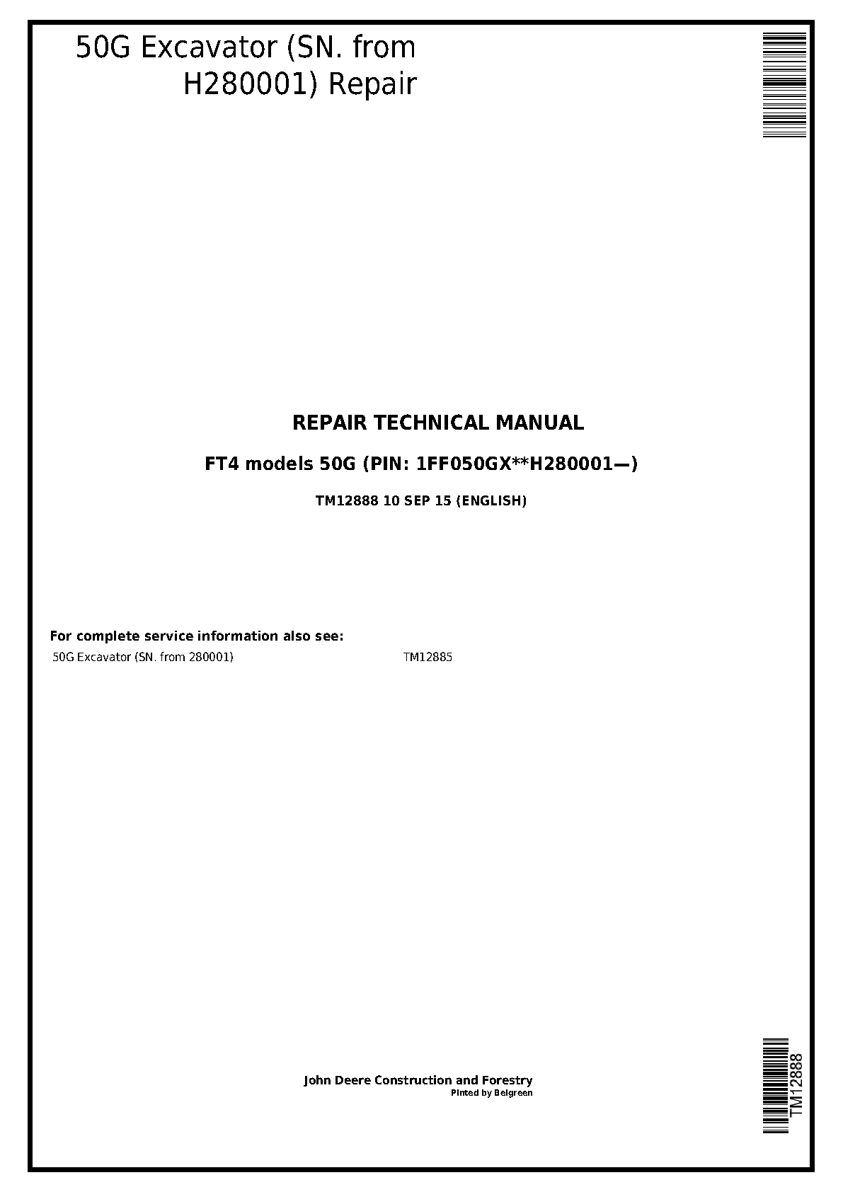 Official John Deere 50G FT4 Excavator Repair Manual (SN H280001+) - TM12888 Edition by John Deere Construction