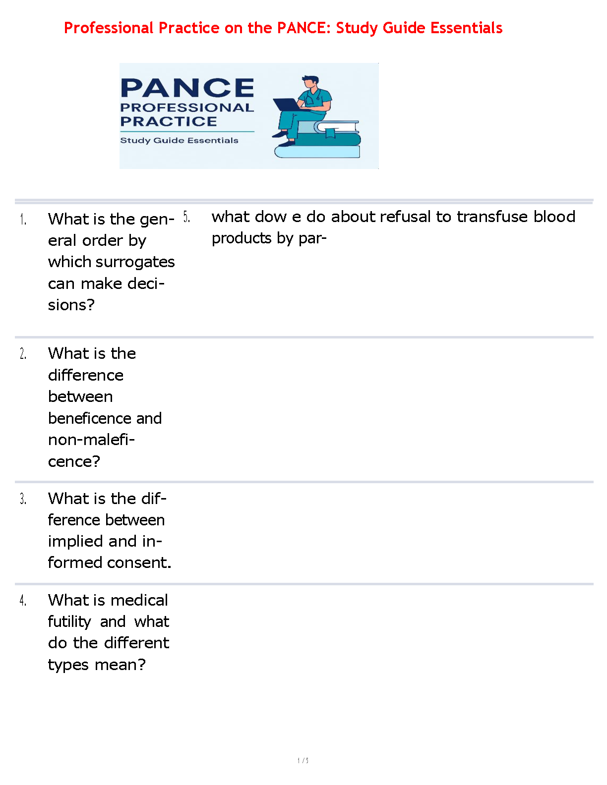 Master the Professional Practice section of the PANCE with our latest 2025/2026 study guide and test bank. This essential resource provides in-depth coverage of crucial topics such as surrogate decision-making, beneficence, non-maleficence, informed consent, and medical futility. Each question is designed to mirror the actual exam, helping you build the confidence and knowledge needed to excel. Prepare effectively, avoid resits, and pass your PANCE certification on the first try with these expertly curated study materials.