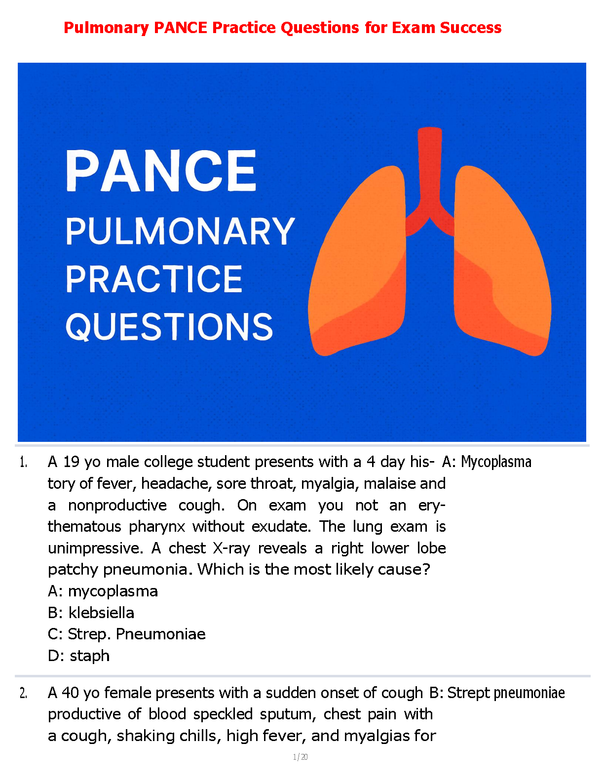 Prepare to ace the pulmonary section of your Physician Assistant National Certifying Examination (PANCE) with our latest 2025-2026 test bank! This resource is specifically designed to help you master complex pulmonology concepts and clinical scenarios that frequently appear on the exam. Inside, you'll find a comprehensive collection of practice questions, complete with detailed answers and rationales, mirroring the format and difficulty of the actual PANCE. This study guide is your key to building confidence, identifying knowledge gaps, and ensuring you pass your certification on the first attempt. Avoid resits and start your PA career strong with this essential exam preparation tool.