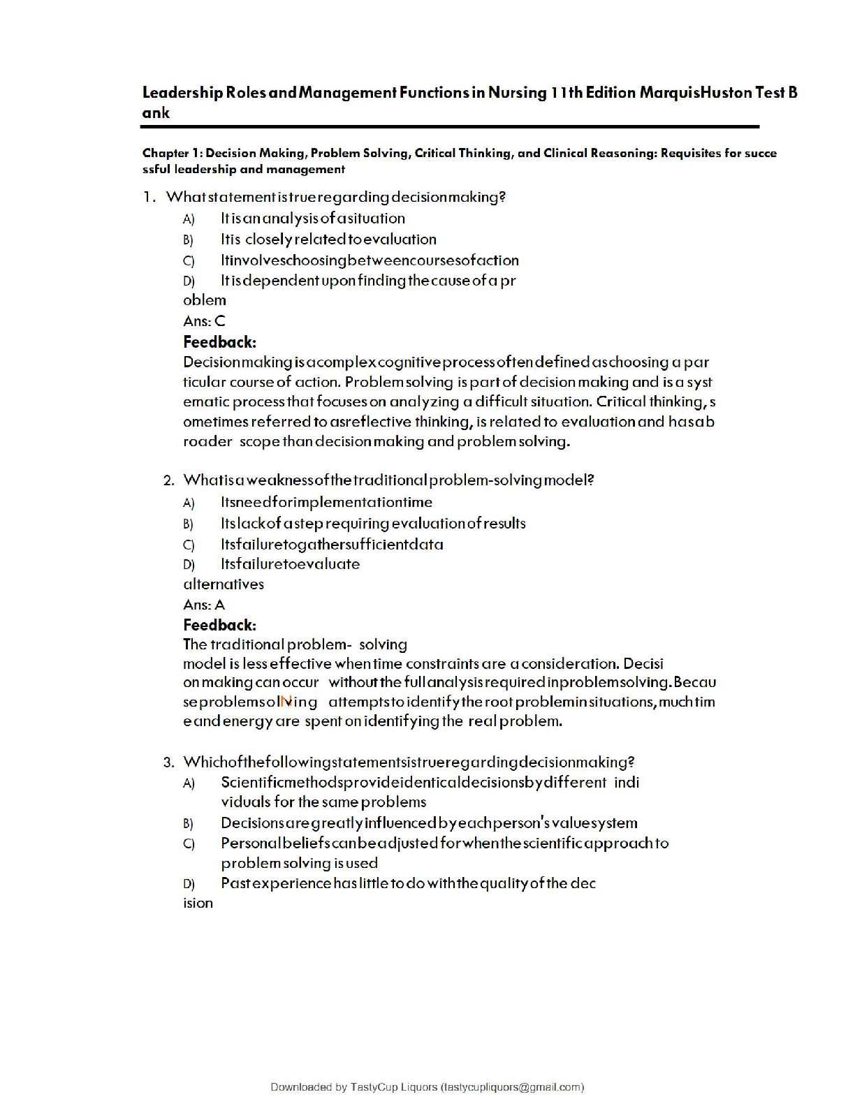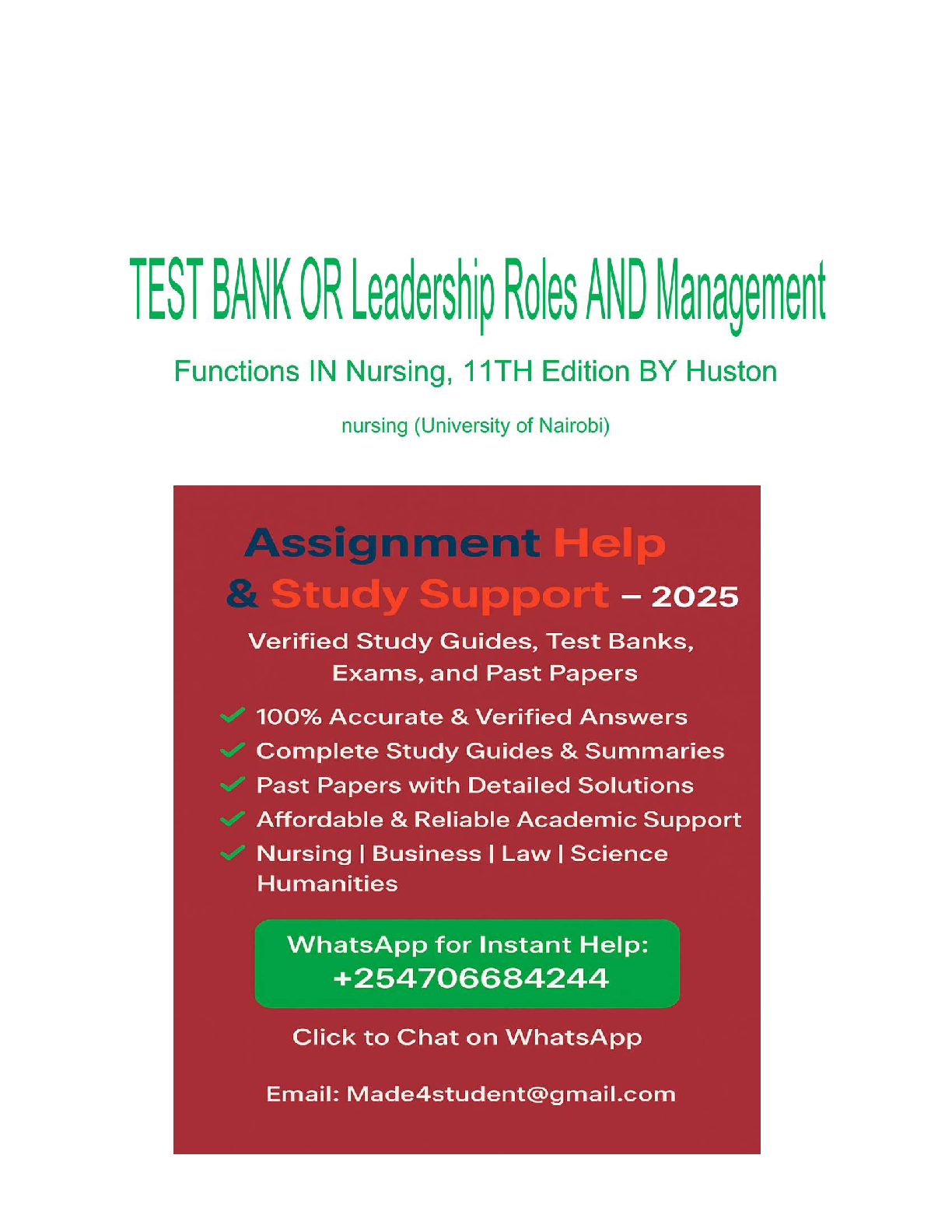 Unlock your full potential and master the complexities of nursing leadership with our comprehensive Test Bank for 'Leadership Roles and Management Functions in Nursing,' 11th Edition by Carol J. Huston. This indispensable study tool provides an extensive collection of exam-style questions, including multiple-choice, fill-in-the-blank, and critical thinking scenarios, all accompanied by verified answers and detailed rationales. Perfectly aligned with the textbook chapters, this test bank helps you pinpoint areas for improvement, reinforce your learning, and confidently prepare for your exams. Gain the edge you need to succeed in your nursing course and future career. Available for instant download.