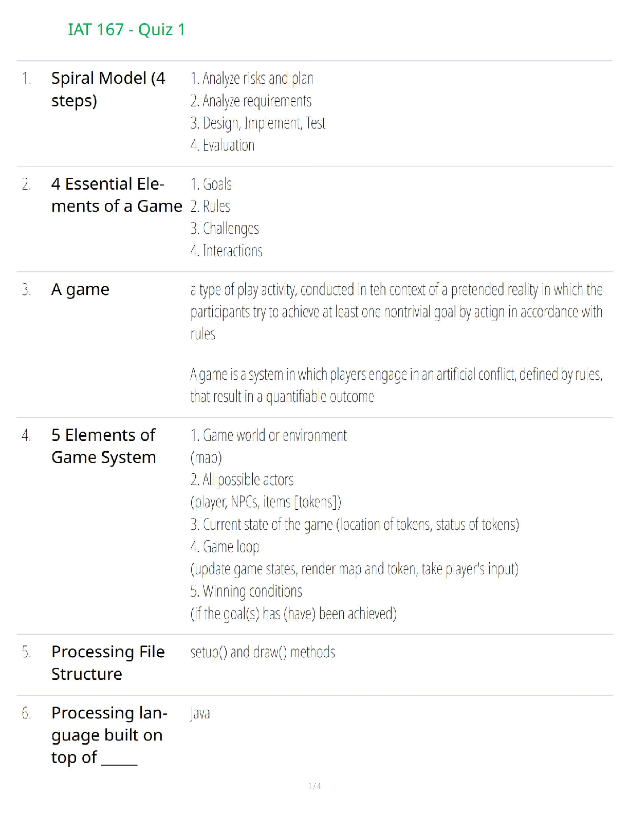 Unlock success in your IAT 167 (Introduction to Computational Art and Design) course with our comprehensive exam elaboration for Quiz 1, fully updated for the 2025/2026 academic year. This essential study guide provides detailed explanations of all key topics you need to know, including the Spiral Model, the 4 Essential Elements of a Game, the 5 Elements of a Game System, and the fundamentals of the Processing language, like its Java foundation and core setup() and draw() methods. Designed to help you grasp complex concepts quickly and efficiently, this resource is your key to passing the quiz on your very first attempt and avoiding costly resits.