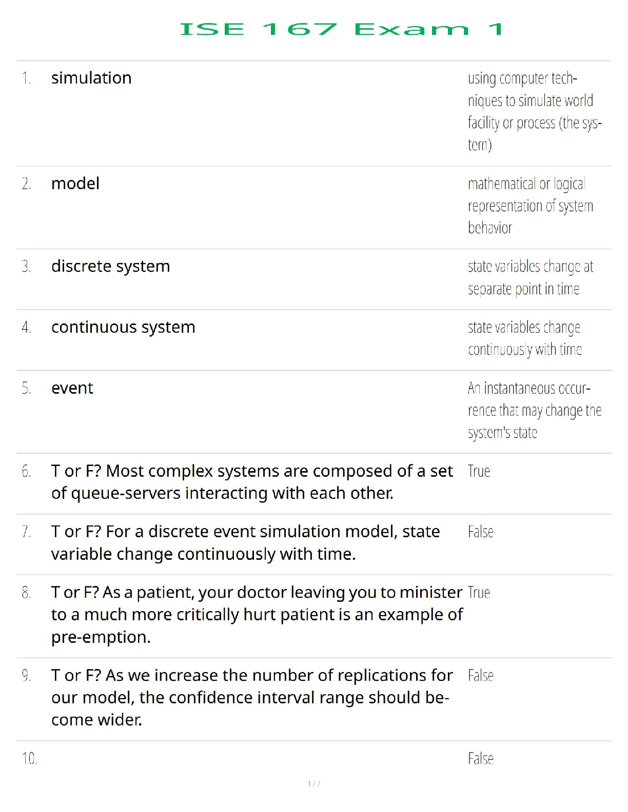 Unlock success in your ISE 167 System Simulation course with this comprehensive test bank covering the core concepts from Exam 1. This resource, aligned with 'Discrete-Event System Simulation, 6th Edition,' provides fully solved questions and clear explanations for fundamental topics. Master key definitions like simulation, models, discrete vs. continuous systems, and events. Deepen your understanding with solved True/False questions on complex systems, queue-servers, and confidence intervals to ensure you are fully prepared to ace your exam.