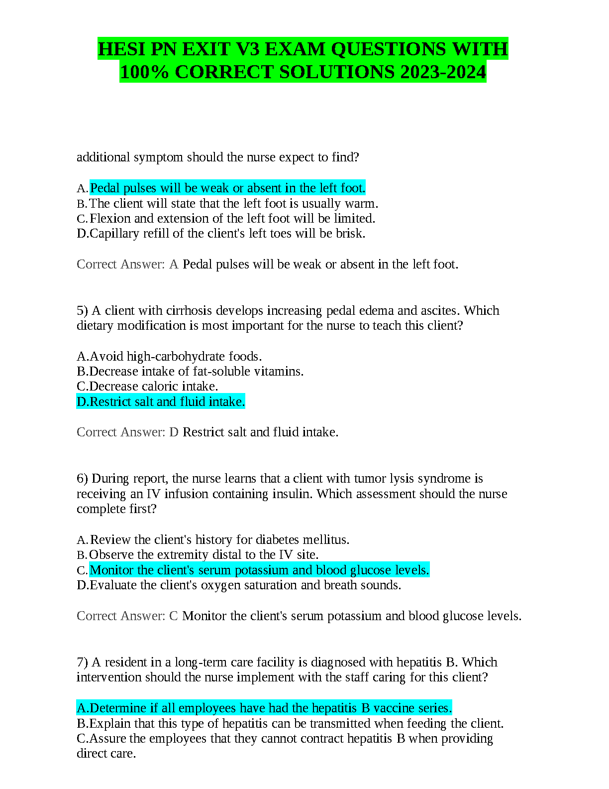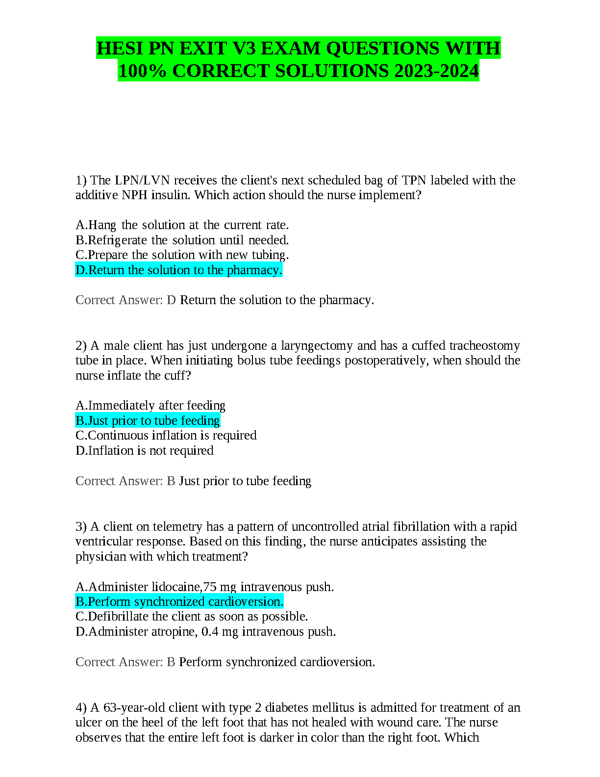 Ace your HESI PN Exit V3 exam with our comprehensive test bank, fully updated for the 2025-2026 academic year. This guide provides an extensive collection of practice questions, each paired with a 100% correct, verified answer. Designed to mirror the actual exam format, it covers all essential PN nursing topics, ensuring you are fully prepared. Master the material, build your confidence, and pass on your very first attempt, saving you time and the stress of resits. Get the ultimate study tool for your HESI PN Exit V3 success.