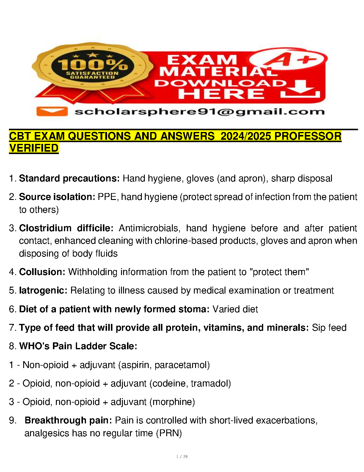 Ace your Nursing and Midwifery Council (NMC) Computer-Based Test (CBT) with confidence! This comprehensive test bank for the 2025/2026 academic year provides a complete collection of professor-verified questions and detailed answers, covering all essential topics you'll face on the exam. Master crucial areas such as standard precautions, infection control, pain management using the WHO ladder, source isolation, patient nutrition, and professional ethics. Our expertly curated content is designed to mirror the actual exam format, helping you understand key concepts and apply them effectively. Avoid the stress of resits and secure your UK nursing registration on your first try. Download now and take the first step towards a successful nursing career in the UK!