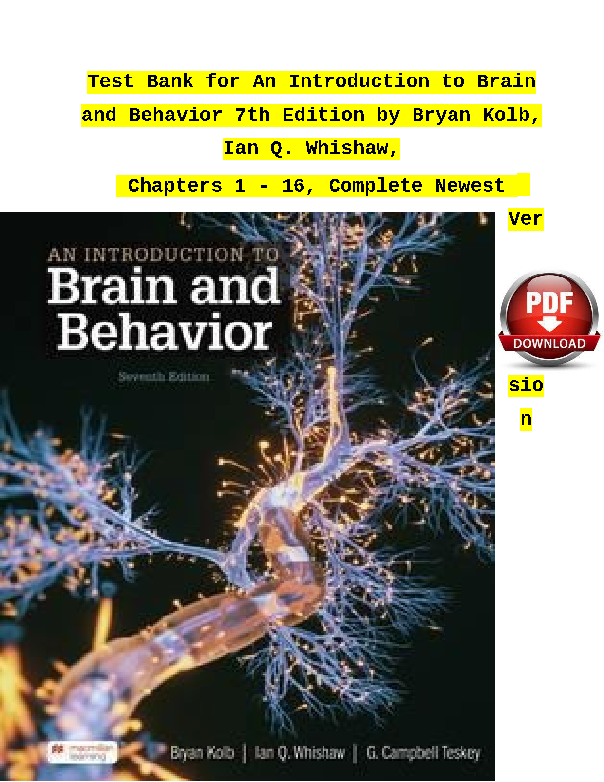 Test Bank for An Introduction to Brain and Behavior, 7th Edition by Bryan Kolb, Ian Q. Whishaw, and G. Campbell Teskey - Complete Chapters 1-16
