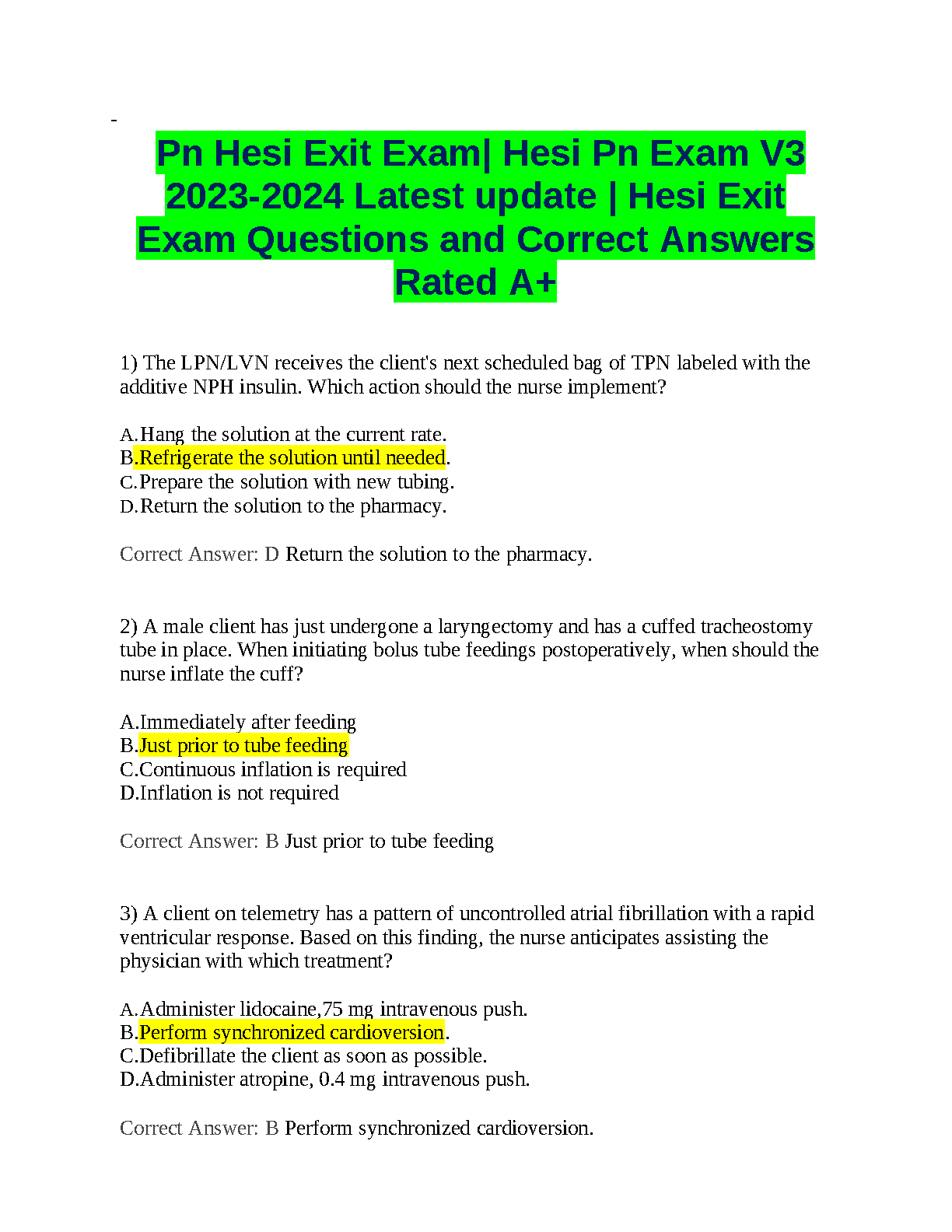HESI PN Exit Exam V3 (Version 3) 2023-2024 | Comprehensive Test Bank with Verified Questions and A+ Graded Answers