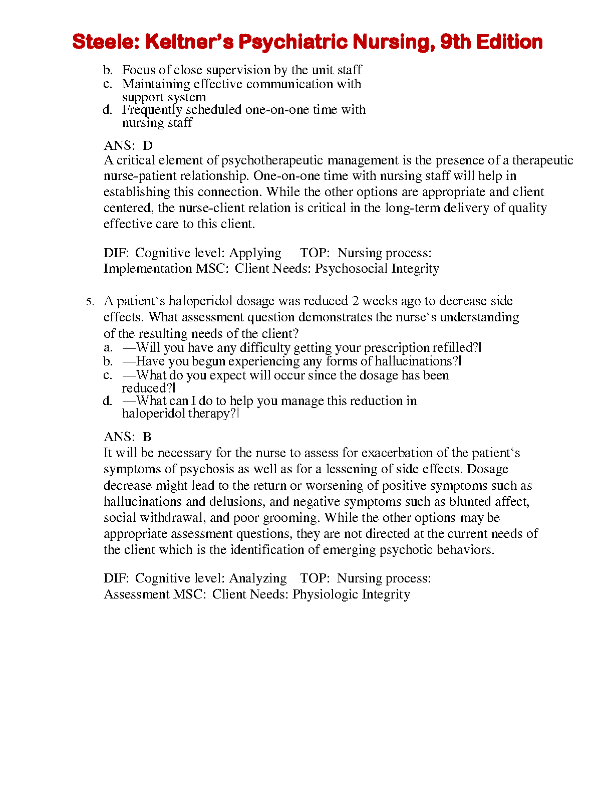 Test Bank for Keltner's Psychiatric Nursing, 9th Edition by Norman L. Keltner, Debbie Steele, & Crystal L. Gethro