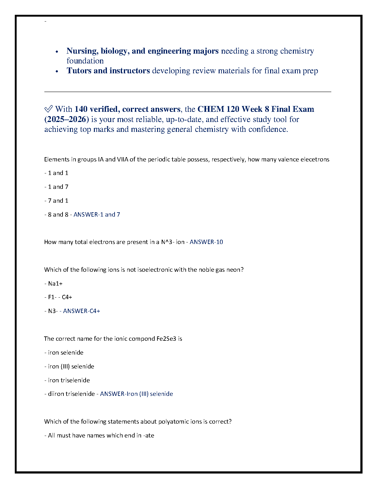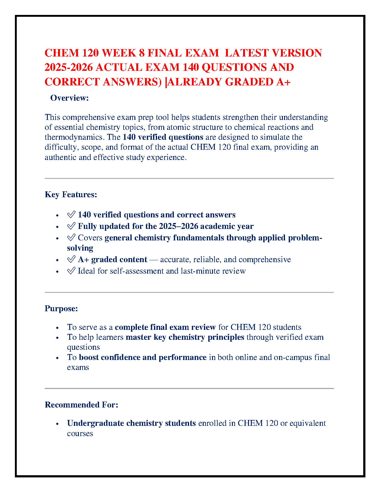Elevate your study strategy and conquer your CHEM 120 final exam with our newly updated 2025-2026 prep guide. This essential resource features 140 meticulously verified questions, complete with correct answers, designed to mirror the format and difficulty of the actual Week 8 final exam. The content is already A+ graded, ensuring accuracy and reliability. Move beyond simple memorization and master the fundamentals of general chemistry, from atomic structure to thermodynamics. This guide is perfect for comprehensive review, self-assessment, and building the confidence you need to pass on your first attempt and avoid resits.