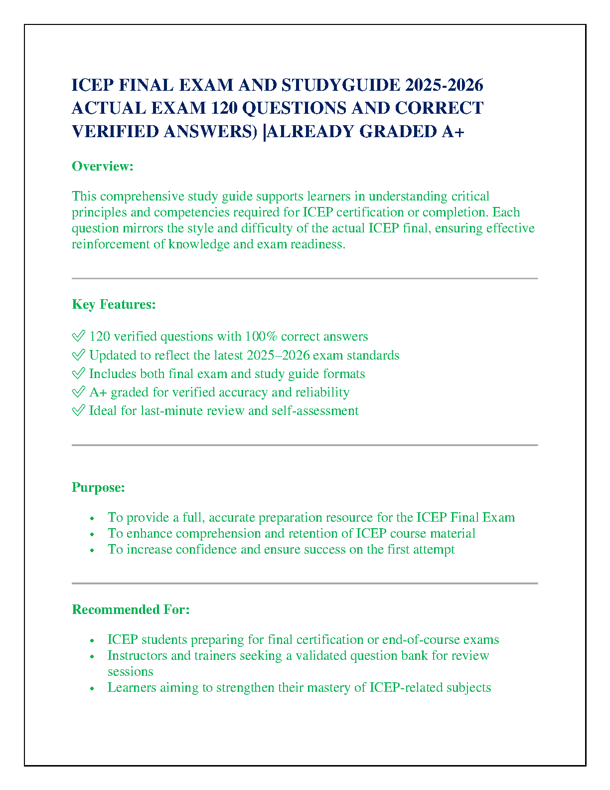 Ace your ICEP Final Exam on the first try with our definitive 2025-2026 Test Bank and Study Guide. This comprehensive resource is expertly designed to guarantee your success, featuring 120 actual exam questions with 100% correct, verified answers. Each question is crafted to reflect the difficulty and style of the real ICEP certification exam, providing you with the most realistic practice available. Our A+ graded material ensures accuracy and reliability, making it the perfect tool for boosting your confidence, mastering key concepts, and achieving top scores without the stress of resits.