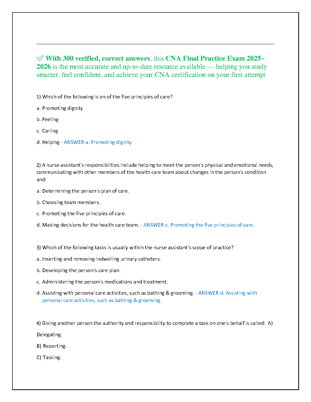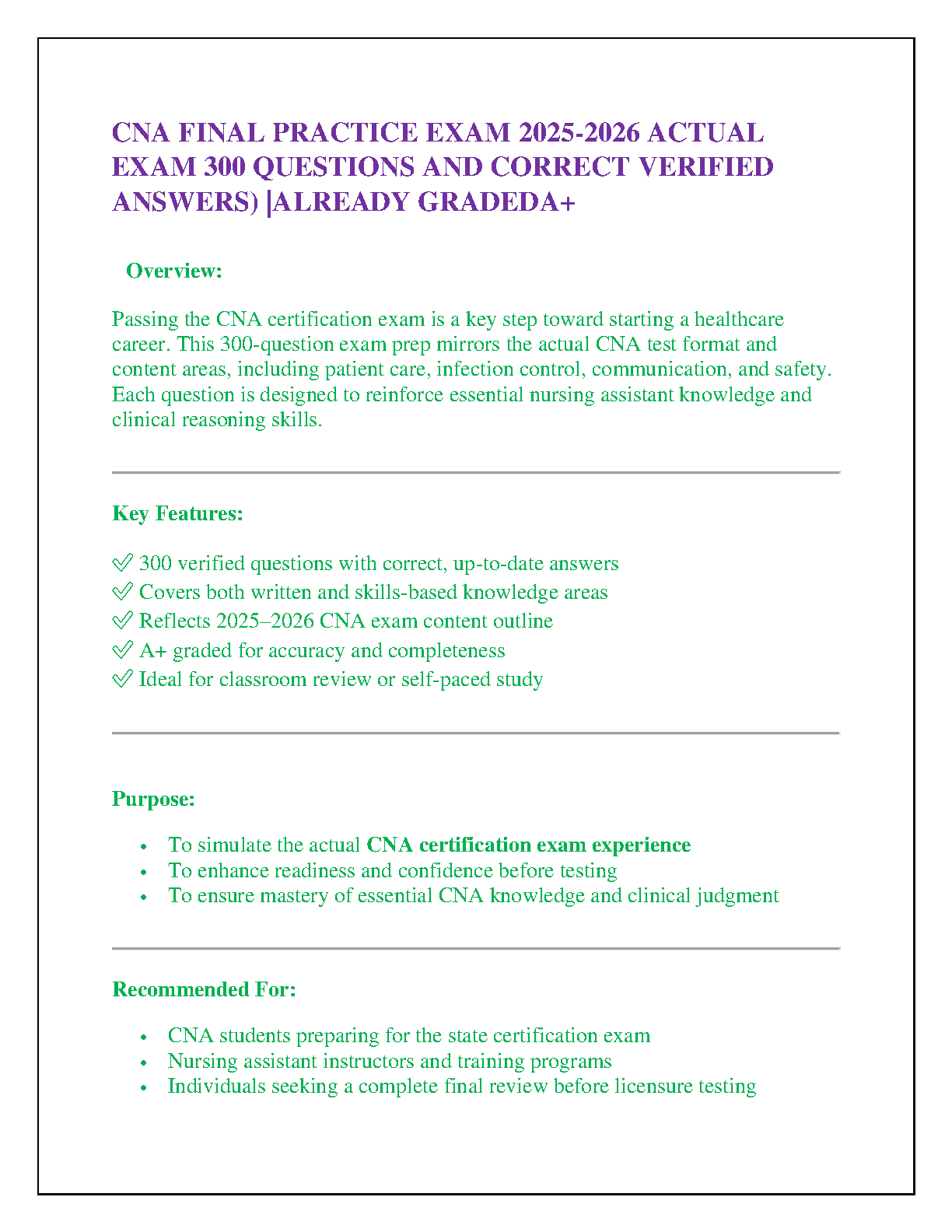 Prepare to ace your Certified Nursing Assistant (CNA) certification exam with our latest 2025-2026 Final Practice Exam Test Bank. This essential study guide is expertly designed to help you pass on your first attempt, eliminating the stress of resits. Inside, you'll find over 300 actual exam-style questions, each with a correct and verified answer. This resource has been A+ graded for accuracy and comprehensiveness, covering all critical topics such as patient care, infection control, communication, and safety. Simulate the real testing experience, build your confidence, and master the essential knowledge needed to launch your healthcare career. Perfect for CNA students and instructors seeking the most reliable and up-to-date preparation tool.