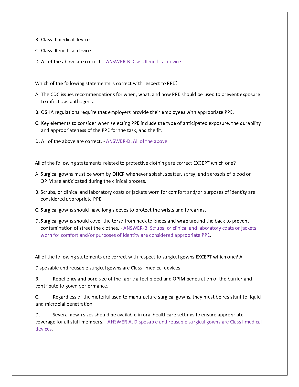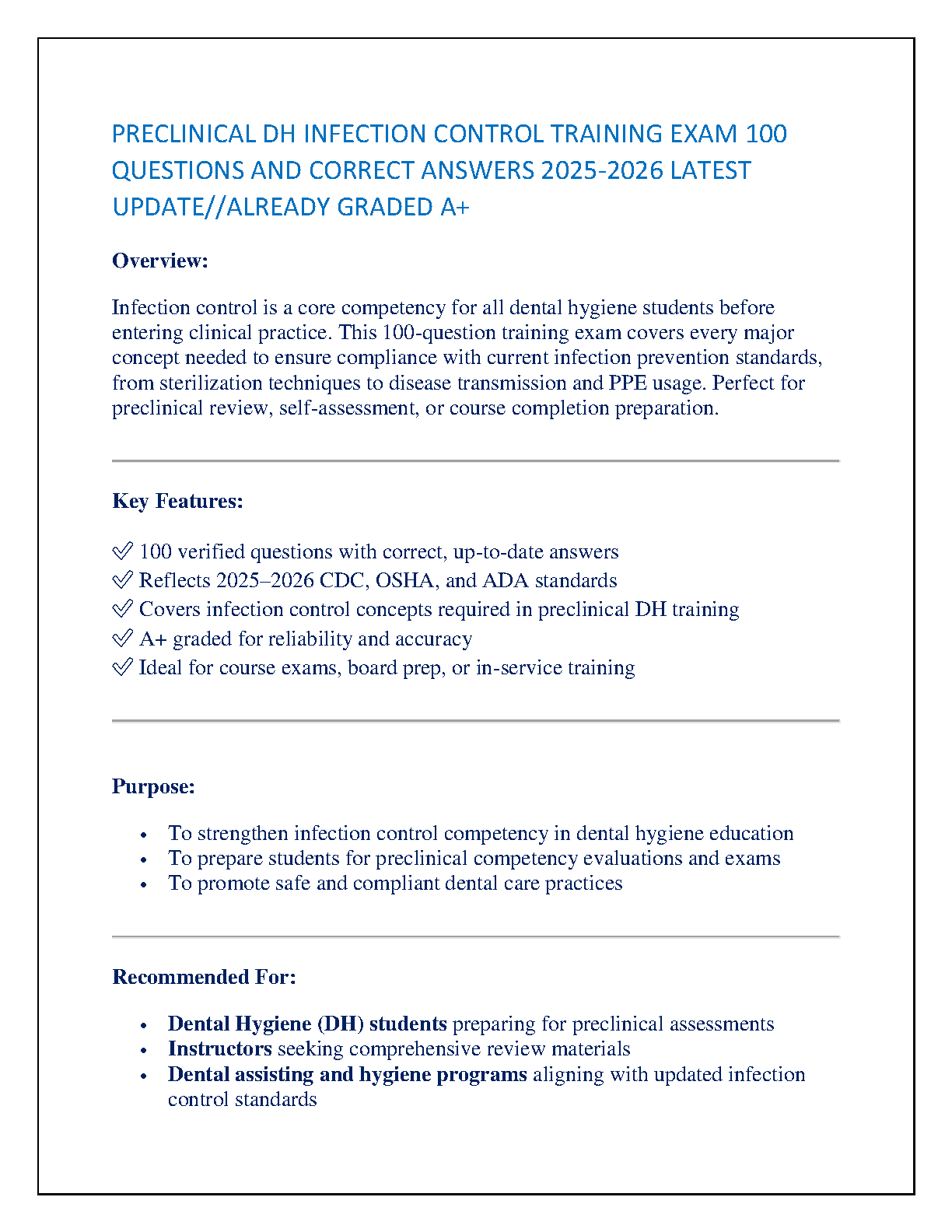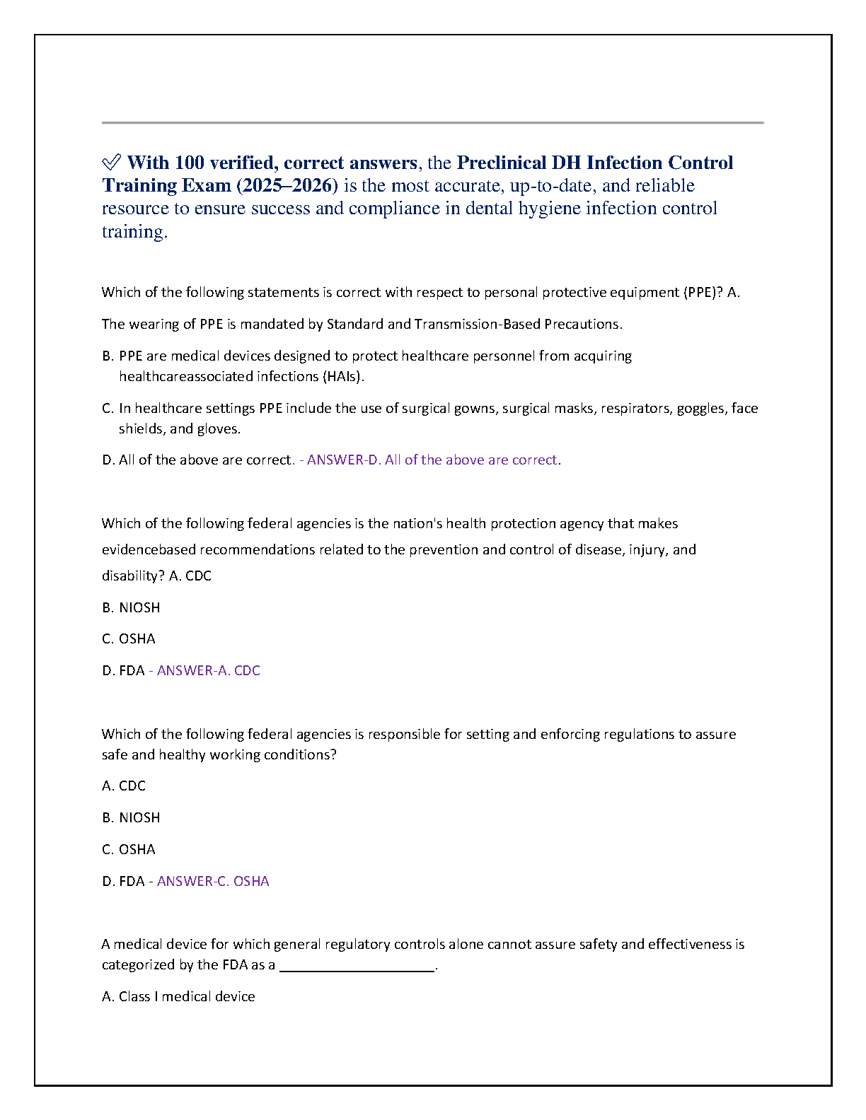 Master the essentials of dental hygiene infection control and ace your exams with our comprehensive 2025-2026 Test Bank. This A+ graded resource features 100 meticulously verified questions and detailed answers, covering everything from sterilization and PPE to disease transmission. Fully updated to reflect the latest 2025-2026 CDC, OSHA, and ADA standards, this guide is your key to success in preclinical assessments, board prep, and clinical practice. Ideal for DH students and instructors, this is the ultimate tool to ensure you pass on your first attempt and practice safely and compliantly.