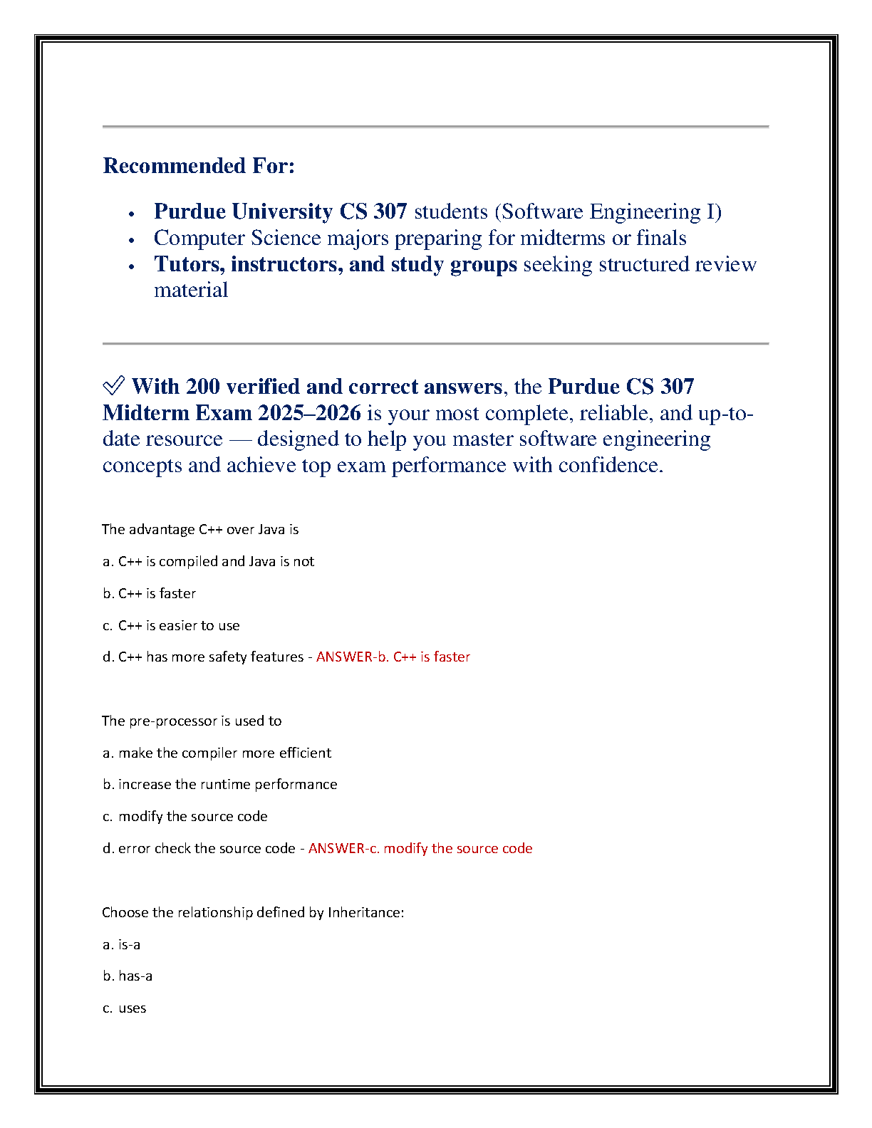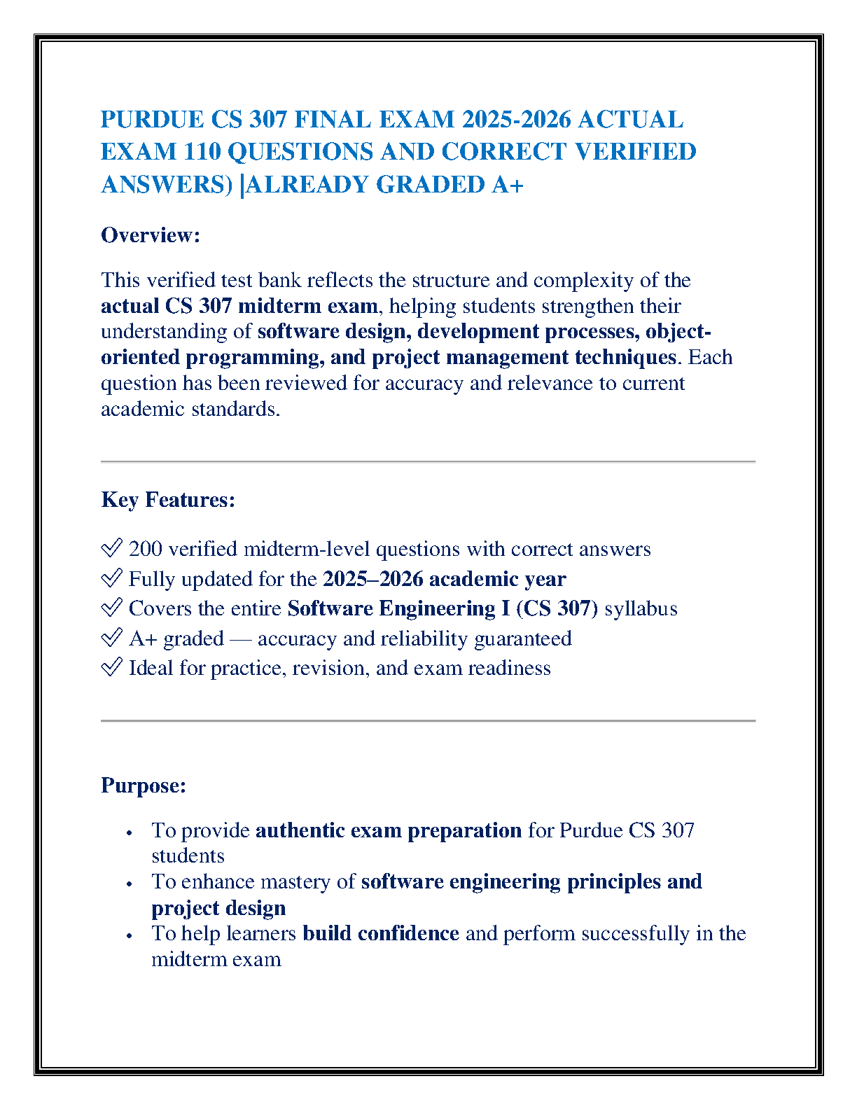 Ace your Purdue CS 307 midterm exam with this ultimate test bank, fully updated for the 2025-2026 academic year. This A+ graded resource contains over 200 verified questions and detailed answers, covering the entire Software Engineering I syllabus including software design, development processes, object-oriented programming, and project management. Designed to mirror the actual exam, this study guide provides authentic practice to boost your confidence, master key concepts, and help you pass on your first attempt, avoiding any resits.