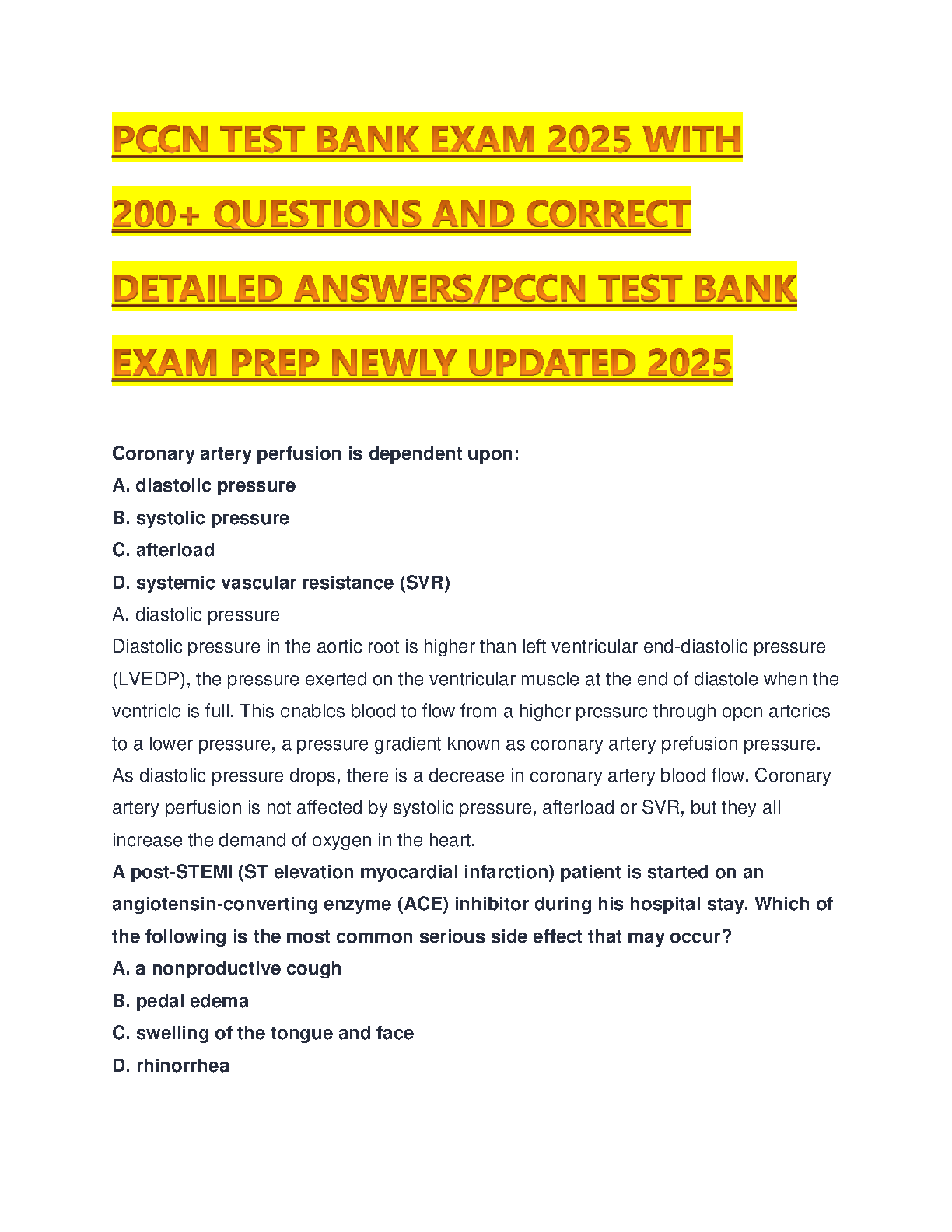 Achieve success on your Progressive Care Certified Nurse (PCCN) exam with our comprehensive 2025 test bank. This newly updated exam prep resource features over 200 practice questions, each accompanied by a correct, detailed answer and rationale. Designed to mirror the actual AACN exam format, this study guide will help you master key concepts, identify areas for improvement, and build the confidence needed to pass on your first attempt. Get instant access to the essential tool for your PCCN certification journey.
