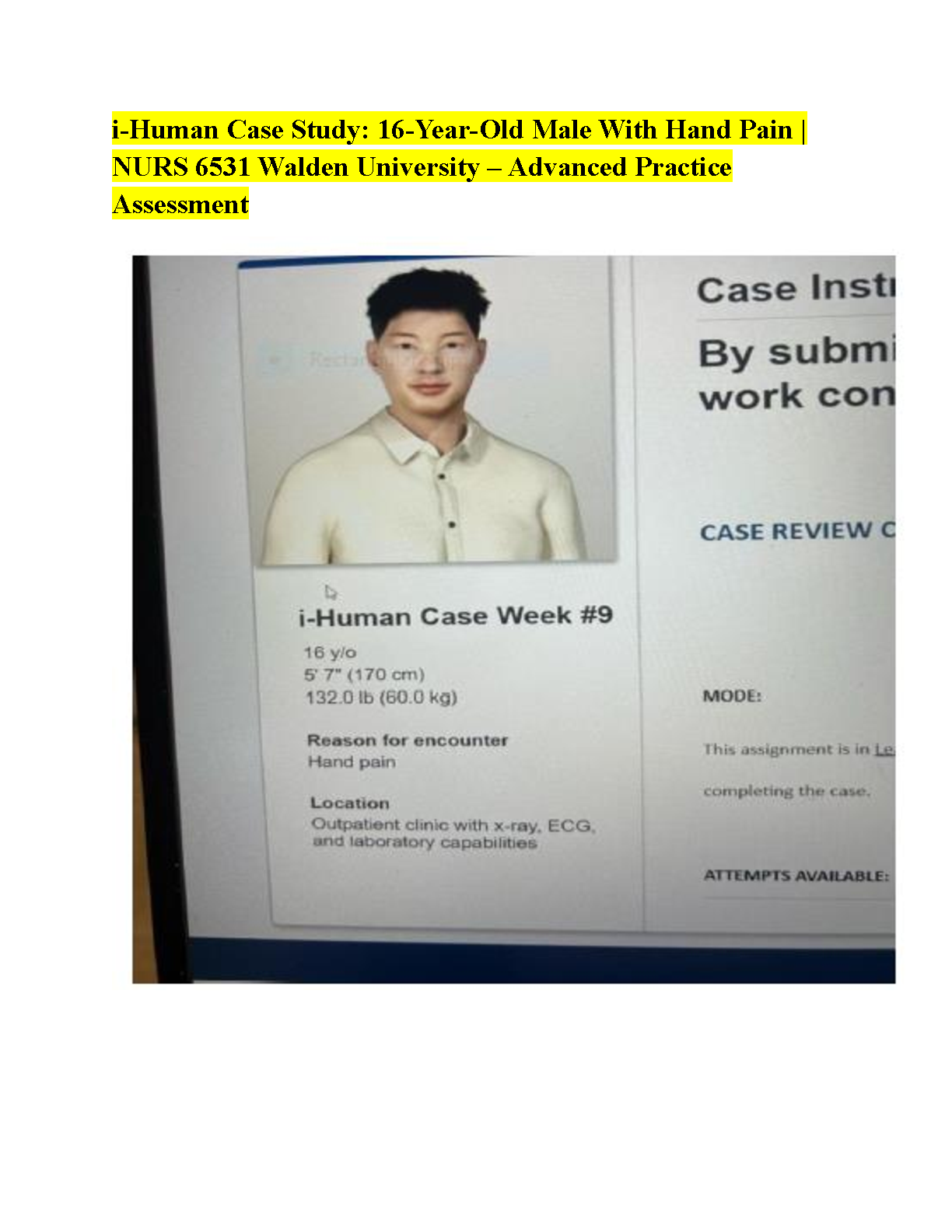 Ace your NURS 6531 Advanced Practice Assessment at Walden University with this complete 2025/2026 guide for the i-Human Week 9 case study. This resource provides a detailed analysis of the 16-year-old male presenting with hand pain, helping you navigate the simulation, formulate accurate diagnoses, and develop a comprehensive management plan. Designed to help you achieve top grades and pass your exams on the first attempt, this study aid is your key to success.
